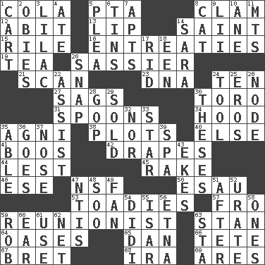 ACROSS 1. Root beer relative 5. Parent Teacher Association (abbr.) 8. Burrowing marine mollusk 12. "This won't hurt ____!" 13. Mouth edge 14. Virtuous person 15. Cause heat under the collar 16. Pleas 19. Beverage made from leaves 20. More disrespectful 21. Glance over 23. Heredity factor (abbr.) 24. Nine, plus one 27. Droops 30. "Corrida" creature 31. Soup utensils 34. Parka part 35. Hindu god of fire 38. Small pieces of grounds 40. Otherwise 41. Scornful sounds 42. Window treatments 44. For fear that 45. Libertine 46. Compass dir. 47. Science/research agcy. 50. He sold his birthright 53. Sycophants 57. Away 59. One who advocates reunion 63. Comedian Laurel of Laurel & Hardy 64. Fertile tracts in a desert 65. Daniel's nick name 66. Wig 67. Cy Young winner Saberhagen 68. Retirement account (abbr.) 69. Ancient Greek god of war DOWN 1. Heavy open wagon 2. Off-Broadway awards 3. Pale purple color 4. Had dinner 5. Entreaty 6. Metal containers 7. Flats, for short 8. Domesticated feline 9. Cards in a Roman deck? 10. One (Scot) 11. Mountains (abbr.) 14. "Two Mules for Sister ____" 17. To free from 18. Car or cant ending 20. Fastener 22. Aid 24. Instrument 25. Greek god of love 26. Connecting point 28. Grand Old Party 29. Disposed of to a purchaser 30. College papers 32. And not 33. Play the lead 35. Competent 36. Travels 37. Characteristic smell of wine 39. Health resort 43. Makes supply last 47. Nuclear Threat Initiatives 48. "Barney Miller" actor Jack 49. Air blower 51. Following 52. A salt of uric acid 54. "You Light Up My Life" star Conn 55. Austrian river, tributary to the Danube 56. Inactive volcano in Sicily 58. Singles 59. Director Reiner 60. Ewer handle 61. Purpose 62. Fish or hair follower 63. R.R. building