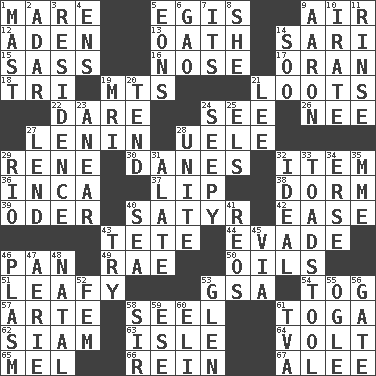 ACROSS 1. Female horse 5. Armor plate that protects the chest 9. Atmosphere 12. An important port of Yemen 13. Pledge 14. Indian skirt 15. Backtalk 16. Characteristic smell of wine 17. NW Algerian seaport 18. Three (prefix) 19. Mountains (abbr.) 21. Plunders 22. Have the gumption 24. Perceive with the eye 26. Born 27. Soviet premier 1918-24 28. Ubangi River tributary 29. French philosopher Descartes 30. Natives or inhabitants of Denmark 32. A whole individual unit 36. South American Indian 37. Mouth edge 38. Dormintory (informal) 39. Baltic tributary 40. Letch 42. Relaxation 43. False hair 44. Dodge 46. Baking dish 49. Actress Charlotte 50. Petroleums 51. Like summer trees 53. Girls' org. (abbr.) 54. Coat; cloak 57. Johnson of "Laugh-In" 58. Sew up the eyelids of hawks and falcons 61. Ancient Roman robe 62. Thailand, formerly 63. Small island 64. Electrical Unit 65. Cartoonist voice _ Blanc 66. It's straight from the horse's mouth 67. Toward shelter DOWN 1. Vertical spar for supporting sails 2. The sixth month of the Jewish calendar 3. Home 4. Followers of ems 5. Immeasurably long periods of time 6. E Mali city 7. It is 8. A female animal or person 9. Composer Copland 10. Feeling or showing extreme anger 11. Wash lightly 14. "Barney Miller" actor Jack 19. Medical imaging device (abbr.) 20. Look after 21. Area sheltered from the wind 23. Approach 24. Oozy 25. Raised railways 27. Grant temporary use of 28. Join together 29. River (Sp.) 31. Having winglike extensions 32. Perfect 33. Inedible or poisonous agaric 34. Celtic language 35. Madame (abbr.) 40. Ocean 41. Vintage cars 43. Attempt to accomplish something 45. By way of 46. Suffix with ecto or cyto 47. Nest on high 48. Brizilian seaport 52. Opposite of masc. 53. Small, secluded valley 55. Stare 56. Yard entry 58. Title for a knight 59. Compass dir. 60. Connecticut Ivy Leaguer 61. Federal power corp.