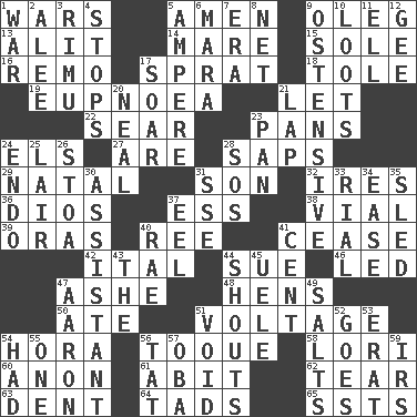 ACROSS 1. Armed conflicts 5. So be it 9. Cassini of fashion 13. Set down 14. Female horse 15. Not divided or shared with others 16. San ____ (Riviera town) 17. Small fatty European fish 18. Lacquered or enameled metalware 19. Normal relaxed breathing 21. Allow 22. Shrivel 23. Zero-star reviews 24. Raised railways 27. "We ___ not amused" (Victoria) 28. Plant excrements 29. Relating to or accompanying birth 31. Male offspring 32. Angers 36. "Vaya con ____" 37. Double-curved letter 38. Small bottle 39. Mouths or openings 40. To separate or throw off 41. Desist 42. Slanted text style (abbr.) 44. Take to court 46. Directed 47. American tennis player Robert 48. Coop moms 50. Had dinner 51. Electrical Measurement 54. Israeli folk dance 56. Woman's close-fitting hat 58. Australian parrot (variant) 60. At once, immediately (arch.) 61. "This won't hurt ____!" 62. Pull into pieces 63. Gouge 64. Small amounts or degrees 65. Fast planes DOWN 1. Armed conflict 2. Toward shelter 3. Tall New Zealand timber tree 4. Halts 5. Electrical Unit 6. Hindu Mythology: god of death 7. Period 8. Fish or hair follower 9. Clearly or manifestly demonstrative 10. Plunders 11. Pipe bend 12. Turn to the right 17. Fly high 20. Actress Patricia 21. Infant locale 23. Baking dish 24. Inside; within (prefix) 25. Den 26. Portico 28. Mayday 30. Helper 31. Compass dir. 33. Monetary unit of Yemen 34. Comfort 35. Downhill vehicle 37. Snakelike fish 40. Actress Charlotte 41. Penny 43. Definite Article 44. Yells 45. Ubangi River tributary 47. Composer Copland 49. Table seasonings 51. State of nonexistence 52. Moves 53. Part of Q.E.F. 54. Possessed 55. Single 56. Make lace 57. Chief or king in Benin or Nigeria 59. Big collection agency