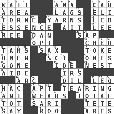 ACROSS 1. Electrical Unit 5. Nanny (var.) 8. Auto 11. Length times width 12. Falls behind 14. Connecticut Ivy Leaguer 15. Singer Mel 17. Tall tales 18. Directed 19. Substance 21. Small island 22. Area sheltered from the wind 23. To sift 24. One of the 12 tribes of Israel 25. Plant excrement 27. Choose 28. "Mermaids" star 31. Scottish caps 35. Saxophone 37. Casino tip 38. Sign of things to come 39. _-fi 41. Washington bills 42. Went 43. Binary compound 45. A home for chicks 46. Assistant 47. Big collection agency 49. Curve 51. Lubricate 52. Lion 55. Big _ 57. Fitting 60. Lacerating 62. Cuckoo 63. Puts on (as clothing) 65. Add up to 66. Small child 67. Indian skirt 68. False hair 69. Declare 70. Friend of Pooh 71. Ancient Greek god of war DOWN 1. Wetness 2. Came up 3. Laconic 4. Docile 5. In the manner of 6. Hindu Mythology: god of death 7. Hindu god of fire 8. Portable communications device 9. Toward shelter 10. Travel on or in a vehicle 13. Fast planes 16. Inside; within (prefix) 17. Gossips 20. Smile enhancers 26. NE Massachussets city 29. Makes supply last 30. Take ten 31. Ancient Roman robe 32. Mine, in Marseilles 33. Ananias' fault 34. Scornful expression 36. One more than ninety 40. Foolish or stupid persons 44. One of the Great Lakes 48. Narrow board 50. Crow sounds 52. 61 cubic inches 53. Maternal 54. Stares at amorously 55. Floor coverings 56. Small Philippine buffalo 58. Lightbulb-shaped fruit 59. Pacific island yam 61. Roll call or roster of names 64. River (Sp.)