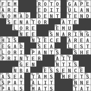 ACROSS 1. Opposite of masc. 4. Printing process, for short 8. Open wide 12. "We ___ not amused" (Victoria) 13. Prepare for publication 14. ____ Bator, Mongolia 15. Wanderer 18. Scratch 19. Be inclined (to) 20. Elected representative 22. Had dinner 23. Old wives' tales, e.g. 24. Australian flightless bird 25. Born 26. Catching in a trap 30. Part of HMS, perhaps 33. Sibling's daughter 36. Type of rug 37. Mild oath 39. Ocean 40. For fear that 41. Australian parrot (variant) 42. Leg coverings 44. A female animal or person 45. Hard copy producer 47. Small island 50. Commissioned mil. rank 51. Nuclear Threat Initiatives 53. Basketball assoc. 54. Center 57. Toward the sea 59. Scottish caps 61. Confronts 63. Argument over a trivial matter 64. Came down and settled, as after flight 65. Compass dir. 66. Friends 67. Floor coverings 68. Make lace DOWN 1. Air blower 2. Greek god of love 3. Klaipeda city 4. Do over again 5. River in Europe 6. Metal container 7. Baseball player Mel 8. From the throat 9. Toward shelter 10. Baking dish 11. Conclude 16. At once, immediately (arch.) 17. Have the gumption 21. Adolescent 22. Nursemaid (var.) 24. Compass dir. 26. Get outta here! 27. Angers 28. Delicate 29. Yard entry 30. Aid 31. Composer Stravinsky 32. Indian skirt 34. Austrian river, tributary to the Danube 35. Car or cant ending 38. Empty-headed or silly people 42. Animal enclosure 43. Without 46. Beverage made from leaves 48. Detail 49. Prong on a fork 52. Aroma 53. Anneal 54. Give off 55. Fast planes 56. Inactive volcano in Sicily 57. Cleo's killer 58. Health resort 59. Scottish cap 60. In the manner of 62. Arrange properly for use