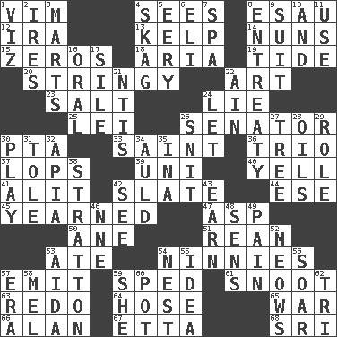 ACROSS 1. Zeal 4. Observes 8. Son of Isaac 12. Retirement account (abbr.) 13. Seaweed 14. Religious women 15. Nothings 18. Roberta Peters solo 19. Periodic rise and fall of the sea level 20. Slender, wiry 22. Tate display 23. Table seasoning 24. Untruth 25. Flowery wreath 26. Elected representative 30. Parent Teacher Association (abbr.) 33. Virtuous person 36. Musical group of three 37. Chops off 39. Single; one (prefix) 40. Shout 41. Came down and settled, as after flight 42. Chalkboard 44. Compass dir. 45. Felt deep pity or tenderness 47. Cleo's killer 50. One (Scot) 51. 480, 500 or 516 sheets of paper 53. Had dinner 54. Simpletons 57. Give off 59. Drove too fast 61. Snout, nose 63. Make new 64. Stockings 65. Armed conflict 66. Actor Alda or Thicke 67. Singer James 68. _ Lanka DOWN 1. Namely 2. Angers 3. Shops 4. Heroin 5. Suggestive of the supernatural 6. Biblical high priest 7. Health resort 8. Plea 9. Set of matching outer garments 10. Plus 11. Purpose 16. Taken by mouth 17. Drop; flow; fall 21. Nuclear Threat Initiatives 22. The 18th letter of the Arabic alphabet 24. Allow 26. In a ____ (agitated or irritated) 27. Woody plant 28. Lubricates 29. Hero or heavy, e.g. 30. Romp 31. Lacquered or enameled metalware 32. Capital of Western Samoa 34. Old (Scot.) 35. _ tizzy (2 wds.) 38. Ski resort town in Vermont 42. Observe 43. Merit 46. Compass dir. 48. Elected reps. 49. Ache 52. Catcalls? 53. Opera by Verdi 54. Egg locale 55. It may be bright or harebrained 56. Fly high 57. Epoch 58. Cartoonist voice _ Blanc 59. A female animal or person 60. Cooking vessel 62. Three (prefix)