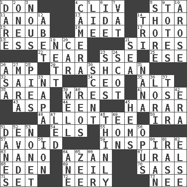 ACROSS 1. Spanish title 4. 154 in Roman numerals 8. R.R. building 11. Small Philippine buffalo 13. Opera by Verdi 14. Son of Odin 15. Reuben's nickname 16. Confront 17. Printing process, for short 18. Substance 21. Founders of families 22. Rend 23. Compass dir. 25. Compass dir. 26. Electrical Unit 29. File 13 32. Inhabitant of Heaven 34. Corporate head (abbr.) 35. The first octave above the treble staff 38. Length times width 39. Obtain by seizing forcibly or violently 41. Sense of smell 43. Viper 44. Car or cant ending 45. Ethiopian city, capital of Harari 46. One to whom something is allotted 50. Lyricist Gershwin 51. Lair 54. Raised railways 55. Like (prefix) 57. Prevent the occurrence of 59. Heighten or intensify 63. Billionth: prefix 64. Muslim summons to prayer 67. Mountain range 68. Paradise 69. Famous astronaut Armstrong 70. Backtalk 71. Arrange properly for use 72. Suggestive of the supernatural 73. Born DOWN 1. Have the gumption 2. Washington bills 3. Common sense 4. Device for capturing images 5. Untruth 6. Binary compound 7. Large container 8. Dinah or Pauly 9. Lugs 10. Came up 12. Collude with 14. Three (prefix) 19. Remaining after all deductions 20. 4-wheeled motor vehicle 21. Ocean 23. "______ My Girl" (Turtles hit) 24. Highlander 26. White ___ sheet 27. Hindu Mythology: god of death 28. Sliced desserts 30. Aroma 31. Nanny 33. California wine valley 36. Australian parrot (variant) 37. Russian ruler of old 39. Water source 40. Vintage cars 42. Epoch 45. Folds over and sews together 47. Directed 48. Without thickness 49. A really long time 51. Natives or inhabitants of Denmark 52. Dodge 53. Music written for nine 56. Musical composition 58. Electrically charged atom 60. SW Asia republic 61. Raze (variant) 62. Otherwise 64. One (Scot) 65. Last letter of the English alphabet 66. Atmosphere