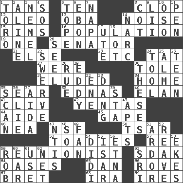 ACROSS 1. Scottish caps 5. Nine, plus one 8. Hoof sound 12. Margarine 13. Chief or king in Benin or Nigeria 14. Annoying sound 15. Basketball hoops 16. Census information 19. Single 20. Legislator 21. Otherwise 23. And so on (abbr.) 24. Make lace 27. Past tense of be (plural) 30. Lacquered or enameled metalware 31. Dodged 34. Residence 35. Wither 38. Ferber et al. 40. Liveliness 41. 154 in Roman numerals 42. Gossips 44. Assistant 45. Open wide 46. Teachers' org. 47. Overdraft (abbr.) 50. Russian ruler of old 53. Sycophants 57. To separate or throw off 59. One who advocates reunion 63. Neighbor of Neb. 64. Fertile tracts in a desert 65. One of the 12 tribes of Israel 66. Be footloose 67. Cy Young winner Saberhagen 68. Retirement account (abbr.) 69. Angers DOWN 1. "Corrida" creature 2. Place in a line 3. Klaipeda city 4. Mayday 5. Drink excessively 6. Inky black, to poets 7. California wine valley 8. Small bed 9. Cards in a Roman deck? 10. Bear (Spanish) 11. Fenced enclosure 14. Drug cop 17. Shoshoni 18. Car dealer's back yard 20. Sew up the eyelids of hawks and falcons 22. Turn aside suddenly 24. Instrument 25. _ mater 26. Adolescent 28. Sorrow 29. Whirlpool 30. College papers 32. Compass dir. 33. Mild oath, euphamism for damn 35. Skim 36. Writer Wiesel 37. Opera by Verdi 39. R.R. building 43. Tenement units (abbr.) 47. Nuclear Threat Initiatives 48. "Barney Miller" actor Jack 49. Avid follower 51. Zeal 52. Break or tear apart 54. "You Light Up My Life" star Conn 55. Austrian river, tributary to the Danube 56. Inactive volcano in Sicily 58. Supplements with great effort 59. Director Reiner 60. Ewer handle 61. Purpose 62. Fish or hair follower 63. Indian title of respect (Mr.)