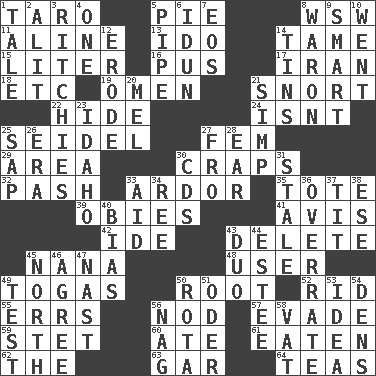ACROSS 1. Edible starchy tuberous root 5. Sliced dessert 8. Compass dir. 11. Place in a line 13. Wedding promise 14. Docile 15. 61 cubic inches 16. Fluid product of inflammation 17. SW Asia republic 18. And so on (abbr.) 19. Sign of something about to happen 21. Derisive sound 22. Flintstone garb 24. Is not 25. A glass for beer 27. Opposite of masc. 29. Length times width 30. Dice game 32. Romantic infatuation 33. Zeal 35. Lug 39. Off-Broadway awards 41. Opinion 42. Binary compound 43. Erase 45. Grandmother 48. One who makes use of a thing 49. Ancient Roman robes 50. Carrot, for example 52. To free from 55. Blunders 56. Allow head to fall sleepily 57. Dodge 59. Proofreading order 60. Had dinner 61. Consumed 62. Definite Article 63. Slender fish 64. Afternoon social gatherings DOWN 1. Story 2. Came down and settled, as after flight 3. Actors Guy, Robert Welles, and Clint 4. Single 5. Corncob 6. Goddess of spring and wife of Bragi 7. Greek goddess of the dawn 8. Make _____ (do battle with) 9. Don Adams' spy role 10. Left 12. Eat (away) 14. Airtight sealed metal containers 20. Cartoonist voice _ Blanc 21. Simple or foolish person 23. Potato state 25. Plant excrement 26. Period 27. From 28. Ewer handle 30. Music discs 31. Lacking originality or spontaneity 33. Help 34. To riddle 36. Make much ado about nothing 37. Teat (slang) 38. Compass dir. 40. Prejudice 43. Superhero pair 44. First name in cosmetics 45. 0 degrees 46. Match 47. Political cartoonist Thomas 49. Trial 50. Round or rotation of duties 51. Baltic tributary 53. It may be bright or harebrained 54. Lairs 56. Tired old horse 58. Large container