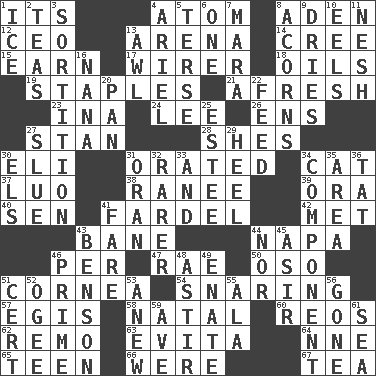 ACROSS 1. ___ a Wonderful Life 4. Tiny particle 8. An important port of Yemen 12. Corporate head (abbr.) 13. Sports stadium 14. Algonquian 15. Merit 17. One who wires 18. Lubricates 19. Paper fasteners 21. Anew 23. _ tizzy (2 wds.) 24. Area sheltered from the wind 26. Followers of ems 27. Comedian Laurel of Laurel & Hardy 28. "______ My Girl" (Turtles hit) 30. Biblical high priest 31. Spoke pompously 34. Feline 37. Nilotic language 38. Indian princess (variant) 39. Mouth or opening 40. Elected rep. 41. Burden 42. Was introduced to 43. Object of repulsion 44. California wine valley 46. For each 47. Actress Charlotte 50. Bear (Spanish) 51. Pupil covering 54. Catching in a trap 57. Armor plate that protects the chest 58. Relating to or accompanying birth 60. Vintage cars 62. San ____ (Riviera town) 63. Webber/Rice musical 64. Compass dir. 65. Adolescent 66. Past tense of be (plural) 67. Beverage made from leaves DOWN 1. Frozen water 2. Afternoon social gatherings 3. Decision 4. Satellite of Uranus 5. Laconic 6. Single 7. Hindu Mythology: god of death 8. Oak nuts 9. Frees from moisture 10. Snakelike fish 11. Delicate 13. Leather borer 16. Nanny 20. Baking dish 22. Nourish 25. First name in cosmetics 27. Change direction abruptly 29. Person who is morally reprehensible 30. Raised railways 31. Northwest Algerian city 32. More uncommon 33. Added to 34. Part 35. Length times width 36. Make lace 41. Conductor's collection 43. Gillaume's butler role 44. Or not 45. SW Saudi Arabia district 46. A-one 48. Moving or stirring 49. Related on the mother's side 51. Foregone conclusion 52. Double curve, resembling the letter S 53. Afresh 55. In the manner of 56. Went 59. "___ Maria" 61. Ocean