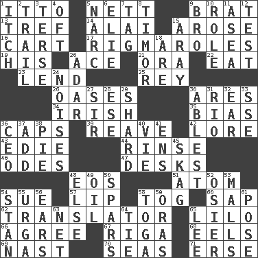 ACROSS 1. "Tell ____ the Marines!" 5. Remaining after all deductions 9. Naughty child 13. Unclean, religiously 14. Mountain range southwest of Kyrgyzstan 15. Came up 16. Draw slowly or heavily 17. Complicated, petty procedures 19. Part of HMS, perhaps 20. Adept person 21. Mouth or opening 22. Erode 23. Grant temporary use of 25. Marina Del _, California 26. Fertile tracts in a desert 30. Ancient Greek god of war 34. From or relating to Ireland 35. Prejudice 36. Smile enhancers 39. Break or tear apart 42. Old wives' tales, e.g. 43. Singer Brickell 44. Wash lightly 46. Lyric poems 47. Writing tables 48. Greek goddess of the dawn 51. Tiny particle 54. Take to court 57. Mouth edge 58. Coat; cloak 60. Plant excrement 62. Interpreter 65. _ and Stitch 66. Match 67. Capital of Latvia 68. Snakelike fish 69. Political cartoonist Thomas 70. Oceans 71. Celtic language DOWN 1. Hankering 2. Hang back 3. Laconic 4. Often (poetically) 5. Drug cop 6. Writer Wiesel 7. Label 8. The easternmost of the Lesser Sundas 9. Sis' sibling 10. Hero or heavy, e.g. 11. At sea 12. Trial 15. Like ___ of sunshine 18. "We ___ not amused" (Victoria) 20. The sixth month of the Jewish calendar 24. Annoying sounds 27. Title for a knight 28. Compass dir. 29. Pottery fragment 30. Most capable 31. River (Sp.) 32. Ewer handle 33. Compass dir. 36. Corporate head (abbr.) 37. Find the sum of 38. Sliced dessert 40. Compete 41. Followers of ems 45. Heroin 48. Otherwise 49. Lubricate 50. Practice fights 52. Flexible twig of a willow tree 53. Shopping centers 54. Comedian Laurel of Laurel & Hardy 55. Capital and largest city of Mongolia 56. Hearing organs 58. Ancient Roman robe 59. Mouths or openings 61. Introduce or present, as a question 63. Fish or hair follower 64. Standoff 65. Area sheltered from the wind