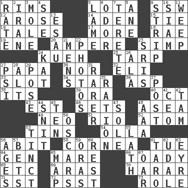ACROSS 1. Basketball hoops 5. Globular water bottle used in Asia 9. Compass dir. 12. Came up 14. Arabian gulf 15. Standoff 16. Stories 17. Greater amount 18. Actress Charlotte 19. Compass dir. 20. Electrical Unit 23. Simple or foolish person 24. Malaysian steamed pastry 25. Canvas cover 27. Dad 30. And not 32. Connecticut Ivy Leaguer 33. Narrow opening 34. Play the lead 36. Cleo's killer 38. ___ a Wonderful Life 39. Mouth or opening 40. Sep. follower 43. Eastern Standard Time (abbr.) 46. Arranges properly for use 48. At sea 49. Modern: prefix 51. _ de Janeiro 52. Smallest unit of an element 53. Airtight sealed metal containers 54. Spanish pot 56. "This won't hurt ____!" 58. Pupil covering 61. Third day of the wk. 64. Commissioned mil. rank 65. Female horse 66. Sycophant 68. And so on (abbr.) 69. Ancient river in northeast Turkey 70. Ethiopian city, capital of Harari 71. Fast jet (abbr.) 72. Inconspicuous attention getter 73. Hero or heavy, e.g. DOWN 1. Assign a rank or rating to 2. SW Asia republic 3. Undercover agent 4. Compass dir. 5. Unable to walk 6. Aroma 7. Cylindrical with tapered ends 8. One (Scot) 9. Empty completely 10. Thailand, formerly 11. Shed a tear 13. Son of Isaac 21. Not women's 22. Pictures 23. Indian titles of respect 24. Krazy ___ of comics 26. According to 27. Air pressure measure (abbr.) 28. The first octave above the treble staff 29. Airs 31. More uncommon 35. Food allowance for one day 37. Mail 41. Corporate head (abbr.) 42. Scottish cap 44. In a ____ (agitated or irritated) 45. "___ Little Indians" 47. Flatfish 48. American Automobile Association (abbr.) 50. Motion picture awards 53. Tinged 55. Thin strip of wood or metal 56. Matures 57. Antes 59. Mouths or openings 60. Respite 61. Edible starchy tuberous root 62. Hereditary estate 63. Jane of fiction 65. Atlas unit 67. Boat paddle