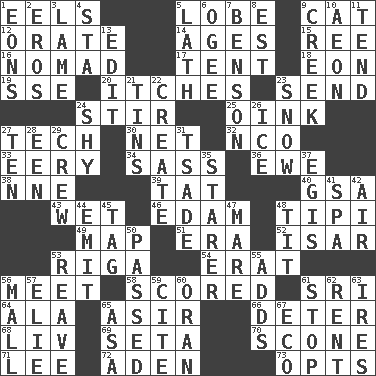 ACROSS 1. Snakelike fish 5. Ear part 9. Domesticated feline 12. Declaim 14. Eons 15. To sift 16. Wanderer 17. Portable shelter 18. Age 19. Compass dir. 20. Irritating cutaneous sensations 23. Post 24. Use a spoon 25. Pig sound 27. Technology 30. Fish or hair follower 32. Non-commissioned officer (abbr.) 33. Suggestive of the supernatural 34. Backtalk 36. She-sheep 38. Compass dir. 39. Make lace 40. Girls' org. (abbr.) 43. Soggy 46. Dutch treat 48. Native american tent (variation) 49. Atlas unit 51. Period 52. Austrian river, tributary to the Danube 53. Capital of Latvia 54. Part of Q.E.F. 56. Confront 58. Tallied 61. Indian title of respect (Mr.) 64. According to 65. SW Saudi Arabia district 66. Prevent from occurring 68. 54 in ancient Rome 69. Bristle 70. Biscuitlike quick bread 71. Area sheltered from the wind 72. Arabian gulf 73. Chooses DOWN 1. Immeasurably long periods of time 2. Greek god of love 3. Unable to walk 4. R.R. building 5. Thin strip of wood or metal 6. Double curve, resembling the letter S 7. Gillaume's butler role 8. Eastern Standard Time (abbr.) 9. Small stream 10. A really long time 11. Look after 13. Prepare for publication 21. Metal containers 22. Cause to be 23. Frozen precipitation 24. Like a shrinking violet 26. Frozen water 27. Nine, plus one 28. Car or cant ending 29. Ship's personnel 31. Sadhe (variant) 35. A viewer who gazes fixedly 37. Armor plate that protects the chest 41. Health resort 42. Wind 44. Send forth 45. Label 47. Female horse 48. Teat (slang) 50. Went by 53. Rob, plunder, or pillage 55. Sums up 56. Promenade 57. Writer Wiesel 59. Quote 60. Northwest Algerian city 61. Discontinue 62. Monthly bill 63. Angers 65. White ___ sheet 67. Environmental prefix