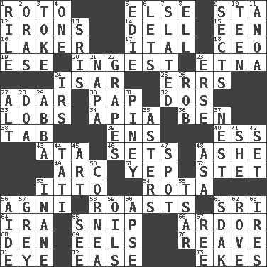 ACROSS 1. Printing process, for short 5. Otherwise 9. R.R. building 12. Removes the wrinkles 14. Small valley 15. Car or cant ending 16. Member of a famous L.A. basketball team 17. Slanted text style (abbr.) 18. Corporate head (abbr.) 19. Compass dir. 20. Consume 23. Inactive volcano in Sicily 24. Austrian river, tributary to the Danube 25. Blunders 27. The sixth month of the Jewish calendar 30. Infant food 32. Two (Sp.) 33. Tennis shots 34. Capital of Western Samoa 36. Benjamin's nick name 38. Keyboard key 39. Followers of ems 40. Double-curved letter 43. "One Day ___ Time" 46. Puts into a specified state 48. American tennis player Robert 49. Curve 51. Slangy assent 52. Proofreading order 53. "Tell ____ the Marines!" 54. Roll call or roster of names 56. Hindu god of fire 58. Exposes to great heat 61. Indian title of respect (Mr.) 64. Retirement account (abbr.) 65. Sever or remove by pinching or nipping 66. Zeal 68. Lair 69. Snakelike fish 70. Rob, plunder, or pillage 71. Sight organ 72. Comfort 73. Supplements with great effort DOWN 1. Cause heat under the collar 2. Mouths or openings 3. Casino tip 4. Single 5. Singer Brickell 6. Allows 7. Scheduled 8. Pipe bend 9. Religious groups 10. Adolescent 11. Small Philippine buffalo 13. Indian titles of respect 21. California wine valley 22. Raisin fruits 23. Celtic language 24. Big collection agency 26. Director Reiner 27. Keyboard modifier key 28. ___ good deed 29. Swedish rock group 31. Abounding in pines 35. Michaelmas daisies 37. A home for chicks 41. A female animal or person 42. Put into a specified state 44. Jacques of French films 45. Nonscientific branch of learning 47. Blemish 48. White ___ sheet 50. Pupil covering 53. Lacking in sense or substance 55. Russian ruler of old 56. Assistant 57. Jennifer or Joel 59. Lubricates 60. Domed church section 61. Neighbor of Neb. 62. Be footloose 63. Angers 65. Perceive with the eye 67. To separate or throw off