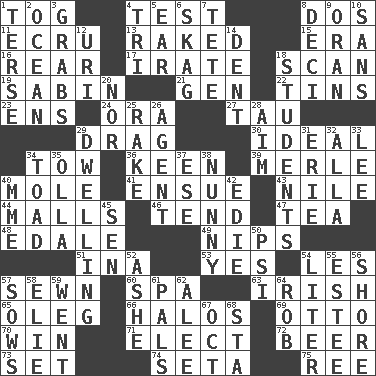 ACROSS 1. Coat; cloak 4. Trial 8. Two (Sp.) 11. Shade of tan 13. Moved through 15. Epoch 16. Tail end 17. Feeling or showing extreme anger 18. Glance over 19. Unit of acoustic absorption 21. Commissioned mil. rank 22. Metal containers 23. Followers of ems 24. Mouth or opening 27. The 19th letter of the Greek alphabet 29. To trail on the ground 30. Perfect 34. Pull behind 36. Peachy ____! 39. Haggard of country music 40. Undercover agent 41. Take place subsequently 43. Mediterranean tributary 44. Shopping centers 46. Watch over 47. Afternoon social gathering 48. Peak District village in England 49. Cuts off 51. _ tizzy (2 wds.) 53. Affirmative reply 54. French article 57. Stitched 60. Health resort 63. From or relating to Ireland 65. Cassini of fashion 66. Saint headwear 69. Von Bismarck 70. Victory 71. Opt 72. Fermented drink made from hops 73. Put into a specified state 74. Stalk of a moss capsule 75. To riddle DOWN 1. Laconic 2. Sea 3. Catches 4. Three (prefix) 5. Ewer handle 6. Heroin 7. False hair 8. Tenth: prefix 9. Northwest Algerian city 10. Without 12. RI univ. 14. Gouge 18. SAT takers 20. Or not 25. Immoral or dissolute person 26. Representative 28. Direct toward a target or goal 29. Residence 31. One of the Great Lakes 32. Silent film actress Nazimova 33. Area sheltered from the wind 34. Frog relative 35. Spanish pot 37. Compass dir. 38. Pet term 40. Madame (abbr.) 42. Singer Brickell 45. Elected rep. 50. Air pressure measure (abbr.) 52. American tennis player Robert 54. 61 cubic inches 55. First name in cosmetics 56. Dinah or Pauly 57. Sty mamas 58. Writer Wiesel 59. Left 61. Friends 62. Toward shelter 64. Director Reiner 67. Sep. follower 68. R.R. building
