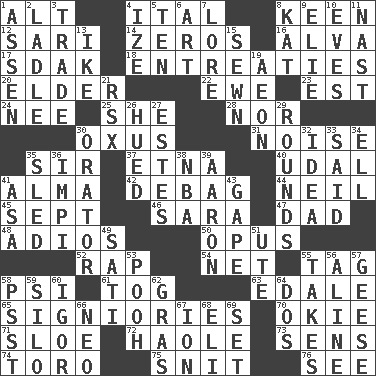 ACROSS 1. The first octave above the treble staff 4. Slanted text style (abbr.) 8. Peachy ____! 12. Indian skirt 14. Nothings 16. Inventor's middle name 17. Neighbor of Neb. 18. Pleas 20. A person who is older than you are 22. She-sheep 23. Eastern Standard Time (abbr.) 24. Born 25. A female animal or person 28. Or not 30. Amu Darya 31. Annoying sound 35. Title for a knight 37. Inactive volcano in Sicily 40. Freehold land 41. _ mater 42. Debunk (Brit. slang) 44. Famous astronaut Armstrong 45. Back-to-school mo. 46. "Two Mules for Sister ____" 47. Male parent 48. Goodbye (Sp.) 50. Musical composition 52. Reproach for some lapse or misdeed 54. Fish or hair follower 55. Label 58. 23rd letter of the Greek alphabet 61. Coat; cloak 63. Peak District village in England 65. Seigniories (variant) 70. Migrant worker of the '30s 71. _ gin 72. White Person, in Hawaii 73. Elected reps. 74. "Corrida" creature 75. In a ____ (agitated or irritated) 76. Perceive with the eye DOWN 1. NE Netherlands city 2. Dipping utensil 3. Barter 4. Ending with capital 5. "___ Little Indians" 6. Nonscientific branch of learning 7. Old wives' tales, e.g. 8. Krazy ___ of comics 9. Writer Wiesel 10. Nights before holidays 11. Political cartoonist Thomas 13. D.D.E's nickname 15. Stitched 19. Age 21. Acura sports coupe 26. Took on color 27. _____ Park, CO 29. Periods in a boxing match 30. Speaker 32. The content of cognition 33. Alleged 34. Pipe bend 35. Downhill vehicle 36. Body of Kaffir warriors 38. Basketball assoc. 39. Composer Copland 41. White ___ sheet 43. Open wide 49. Suttee (variant) 51. Shoshoni 53. "Silly old bear" 55. Proceeds 56. Place in a line 57. Honkers 58. Inconspicuous attention getter 59. Grain storage tower 60. Russian composer Stravinsky 62. Pate de foie ____ 64. Two (Sp.) 66. Modern: prefix 67. Electrically charged atom 68. Connecticut Ivy Leaguer 69. Arrange properly for use