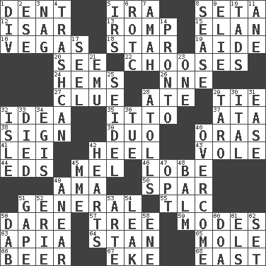 ACROSS 1. Gouge 5. Retirement account (abbr.) 8. Stalk of a moss capsule 12. Austrian river, tributary to the Danube 13. Play 15. Enthusiasm 16. Viva Las _ 18. Play the lead 19. Assistant 20. Observe 22. Opts 24. Cloth borders 26. Compass dir. 27. A slight indication 28. Had dinner 29. Neckwear 32. The content of cognition 35. "Tell ____ the Marines!" 37. _ moment's notice (2 wds.) 38. Signal 39. Superhero pair 40. Mouths or openings 41. Flowery wreath 42. The bottom of a shoe or boot 43. Short-tailed, large-bodied rat 44. Begley and Asner 45. Cartoonist voice _ Blanc 46. Ear part 49. Housemaid (var.) 50. Coast Guard woman 51. Commissioned military rank 55. Affectionate concern, for short 56. Have the gumption 57. Family _ (genealogy) 59. Methods 63. Capital of Western Samoa 64. Comedian Laurel of Laurel & Hardy 65. Undercover agent 66. Fermented drink made from hops 67. Supplement with great effort 68. 90 degrees DOWN 1. HTML Container Element 2. Compass dir. 3. Tired old horse 4. File 13 5. Big collection agency 6. College mil. group 7. Wet nurse 8. Gospel singer Marvin 9. Writer Wiesel 10. Small boys 11. One (Scot) 14. Right away 17. Stitch closed the eyes of (a falcon) 21. Australian flightless bird 23. Single 25. A glass for beer 28. Ringlike coral islands and reefs 29. Pacific island yam 30. Slanted text style (abbr.) 31. Relaxation 32. Small island 33. Passed on 34. Armor plate that protects the chest 36. Third day of the wk. 40. Conquer 42. Centers 45. Madame (abbr.) 47. Choose 48. Lip ointment 49. Approach 51. Open wide 52. One of the Great Lakes 53. Johnson of "Laugh-In" 54. Path through which fluid escapes 56. Small moist lump or mass 58. Compass dir. 60. ___ good deed 61. Raised railways 62. Put into a specified state
