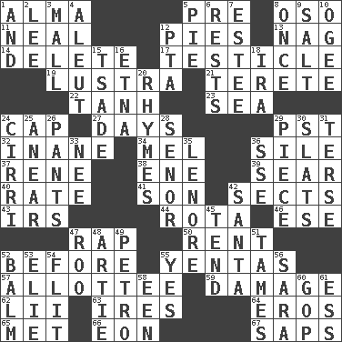 ACROSS 1. _ mater 5. Before (prefix) 8. Bear (Spanish) 11. Anneal 12. Sliced desserts 13. Tired old horse 14. Erase 17. A testis 19. A period of five years 21. Cigar-shaped 22. Hyperbolic tangent 23. Ocean 24. Head covering 27. 24-hour periods 29. Pacific Standard Time (abbr.) 32. Empty; void 34. Cartoonist voice _ Blanc 36. Filth; sediment 37. French philosopher Descartes 38. Compass dir. 39. Dry up 40. Pace 41. Boy, to dad 42. Religious groups 43. Big collection agency 44. Round or rotation of duties 46. Compass dir. 47. Hit sharply and swiftly 50. Monthly bill 52. Prior to 55. Gossips 57. One to whom something is allotted 59. Break 62. Cards in a Roman deck? 63. Angers 64. Greek god of love 65. Was introduced to 66. A really long time 67. Plant excrements DOWN 1. Plus 2. Area sheltered from the wind 3. Shopping center 4. Native American of Southwest Alaska 5. Sliced dessert 6. Musical pauses 7. First name in cosmetics 8. At one time in the past 9. Table seasoning 10. Double curve, resembling the letter S 12. Parent Teacher Association (abbr.) 15. Sadhe (variant) 16. Inactive volcano in Sicily 18. Retirement account (abbr.) 20. Poems 24. High-altitude cloud 25. Approach 26. Leg coverings 28. Sir (Sp.) 29. Part 30. Narrow boards 31. Laconic 33. Born 35. Poe poem 36. Compass dir. 42. Before Barbara or Clara 45. Watch over 47. Friend of Pooh 48. Nick name for Arthur 49. Stone: prefix 51. Makes less strong or intense 52. Lip ointment 53. Writer Wiesel 54. Sudden quick movement 55. Consenting reply 56. "Two Mules for Sister ____" 58. Car or cant ending 60. Grand Old Party 61. Double-curved letter