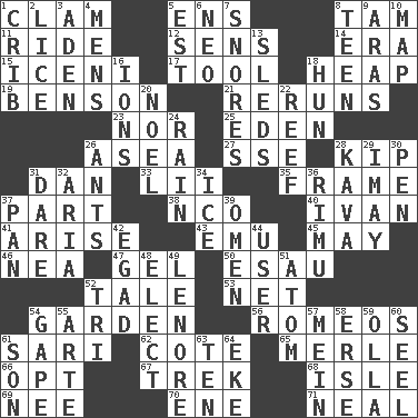 ACROSS 1. Burrowing marine mollusk 5. Followers of ems 8. Scottish cap 11. Travel on an animal 12. Elected reps. 14. Epoch 15. Ancient Celtic tribe of eastern Britain 17. Utensil 18. Pile 19. Gillaume's butler role 21. Summer TV shows 23. And not 25. Paradise 26. Toward the sea 27. Compass dir. 28. Monetary unit of Laos 31. One of the 12 tribes of Israel 33. Cards in a Roman deck? 35. Movie unit 37. Piece 38. Non-commissioned officer (abbr.) 40. "Terrible" tsar 41. Ascend 43. Australian flightless bird 45. Can I? 46. Teachers' org. 47. Set 50. He sold his birthright 52. Story 53. Fish or hair follower 54. Place where plants grow 56. Lover boys 61. Indian skirt 62. ____ d'Azur (French Riviera) 65. Haggard of country music 66. Choose 67. Long journey 68. Small island 69. Born 70. Compass dir. 71. Be tempered by heat DOWN 1. Baby bed with high sides 2. Louse (plural) 3. Arabian gulf 4. Not women's 5. Eastern Standard Time (abbr.) 6. Modern: prefix 7. Sounds asleep 8. Adolescent 9. Ancient river in northeast Turkey 10. Atlas unit 13. Bobsleighs 16. Charged atoms 18. Attila the _ 20. Christmas carol 22. Coral ridge 24. Precipitation 26. Pismires 28. Polynesian shrub of the pepper family 29. "If ____ say so..." 30. Animal enclosure 31. Have the gumption 32. Roberta Peters solo 34. Frozen water 36. Tall New Zealand timber tree 37. Baking dish 39. Presage 42. Mild oath 44. One who uses or employs something 48. Voters do this 49. Poe poem 51. Smallest unit of an element 52. Three (prefix) 54. Open wide 55. Johnson of "Laugh-In" 57. Count _ (2 wds.) 58. Celtic language 59. Spanish pot 60. Stitch closed the eyes of (a falcon) 61. Male child 63. "___ Little Indians" 64. Supplement with great effort