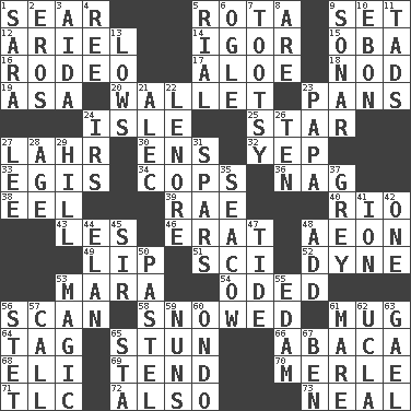 ACROSS 1. Shrivel 5. Roll call or roster of names 9. Put into a specified state 12. Satellite of Uranus 14. Composer Stravinsky 15. Chief or king in Benin or Nigeria 16. Cowboy competition 17. _ vera 18. Allow head to fall sleepily 19. White ___ sheet 20. Place for singles 23. Zero-star reviews 24. Small island 25. Play the lead 27. Cowardly lion portrayer 30. Followers of ems 32. Slangy assent 33. The front part of a cuirass 34. 911 reaches them 36. Tired old horse 38. Snakelike fish 39. Actress Charlotte 40. _ de Janeiro 43. French article 46. Part of Q.E.F. 48. Period of immesurable duration 49. Mouth edge 51. _-fi 52. Centimeter-gram-second unit of force 53. Hindu Mythology: god of death 54. Wrote a lyric poem 56. Examine minutely or intensely 58. Overwhelmed 61. Large cup 64. Label 65. Make senseless or dizzy 66. Phillipine bananalike plant 68. Biblical high priest 69. Look after 70. Haggard of country music 71. Affectionate concern, for short 72. In addition 73. Anneal DOWN 1. "Two Mules for Sister ____" 2. Greek god of love 3. Opera by Verdi 4. To sift 5. Monetary unit of Yemen 6. Stare at amorously 7. A girl or young woman (variant) 8. "We ___ not amused" (Victoria) 9. Underwater navigation system 10. Inky black, to poets 11. Small boys 13. Coldest temperatures 21. Actor Baldwin 22. Poe poem 23. Dad 24. Big collection agency 26. "___ Little Indians" 27. Area sheltered from the wind 28. Grow older 29. Land elevation 31. Practice fights 35. Manatee 37. Jennifer or Joel 41. Electrically charged atom 42. Single 44. Style 45. Title for a knight 47. Event that recurs at intervals 48. Find the sum of 50. Soft color 53. Mysterious quality of enchantment 55. Dutch treat 56. Proofreading order 57. Give a ring to 59. Religious women 60. Southwest Nigerian state 61. Female horse 62. Southern CA. univ. 63. Highlander 65. R.R. building 67. Benjamin's nick name