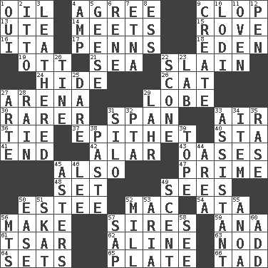 ACROSS 1. Lubricate 4. Match 9. Hoof sound 13. Shoshoni 14. Confronts 15. Be footloose 16. Call ___ day 17. Actor Sean's family 18. Locale of original sin 19. Baseball player Mel 21. Ocean 22. Killed 24. Flintstone garb 26. Domesticated feline 27. Sports stadium 29. Ear part 30. More uncommon 31. Connect, as a bridge 33. Wind 36. Make a knot 37. Curse 40. R.R. building 41. Conclusion 42. Having or resembling wings 43. Fertile tracts in a desert 45. In addition 47. First class 48. Put into a specified state 49. Perceives with the eye 50. First name in cosmetics 52. Apple computer (short form) 54. _ moment's notice (2 wds.) 56. Create 57. Founders of families 59. Santa ___, CA 61. Russian ruler of old 62. Place in a line 63. Dreamland 64. Arranges properly for use 65. Food holder 66. Bit DOWN 1. Fr. "Yes" 2. "Tell ____ the Marines!" 3. Resembling or made to resemble leather 4. Electrical Unit 5. Honkers 6. French philosopher Descartes 7. Inactive volcano in Sicily 8. Double-curved letter 9. Cause to be 10. Farming town in central California 11. Baking chamber 12. Fenced enclosure 20. Prong on a fork 22. Biscuitlike quick bread 23. Experiment locale 25. Have the gumption 27. Johnson of "Laugh-In" 28. Water falling in drops from the sky 29. Cowardly lion portrayer 31. Grain storage tower 32. Parent Teacher Assoc. 33. Aide 34. Detail 35. Raze (variant) 38. Thick mixture 39. Drink excessively 44. Type of rug 45. Michaelmas daisies 46. Area sheltered from the wind 49. Odor 50. Relaxation 51. Three-handed card game 52. Place where flour is made 53. Operatic vocal solo 55. Small Philippine buffalo 56. Mountains (abbr.) 57. Plant excrement 58. Observe 60. Say or write further