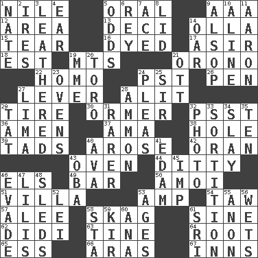 ACROSS 1. Mediterranean tributary 5. Of the mouth 9. American Automobile Association (abbr.) 12. Length times width 13. Tenth: prefix 14. Water jar 15. Lacerate 16. Colored 17. SW Saudi Arabia district 18. Eastern Standard Time (abbr.) 19. Mountains (abbr.) 21. U. of Maine site 22. Like (prefix) 24. Pacific Standard Time (abbr.) 26. Fenced enclosure 27. Prying instrument 28. Came down and settled, as after flight 29. Hoop that covers a wheel 30. Channel Islands abalone 32. Inconspicuous attention getter 36. So be it 37. Housemaid (var.) 38. Hollow 39. Bits 40. Came up 42. NW Algerian seaport 43. Baking chamber 44. Short, simple song 46. Raised railways 49. Soap unit 50. Mine, in Marseilles 51. Country residence 53. Electrical Unit 54. The 23rd letter of the Hebrew alphabet 57. Toward shelter 58. Heroin 61. Trig term 62. "You Light Up My Life" star Conn 63. Prong on a fork 64. Carrot, for example 65. Double-curved letter 66. Ancient river in northeast Turkey 67. Lodging establishments DOWN 1. Nathan's nickname 2. Angers 3. Resembling or made to resemble leather 4. Hearing organ 5. Probability 6. Marina Del _, California 7. Adept person 8. Flaplike covering 9. Columnist Joseph or Stewart 10. Place in a line 11. Composer Copland 14. Rowing implement 19. Madame (abbr.) 20. "Corrida" creature 21. Baseball player Mel 23. Baking chambers 24. Entreaties 25. Title for a knight 27. Pale green bean 28. ID or VA city 29. Make lace 31. Less widely known 32. Picture 33. Drawing lots 34. Kill 35. "___ Little Indians" 40. Actress Gardner 41. Dutch treat 43. Chief or king in Benin or Nigeria 45. Naughty child 46. Dodge 47. Ms. Damita and namesakes 48. Bobsleighs 52. Luau accessory 53. Ripens 55. Soon (poet.) 56. Soaks 58. R.R. building 59. Apertif with cassis 60. Santa ___, CA 61. Indian title of respect (Mr.)