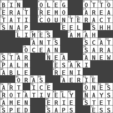 ACROSS 1. Storage container 4. Cassini of fashion 8. Von Bismarck 12. Part of Q.E.F. 14. San ____ (Riviera town) 15. Length times width 16. Jacques of French films 17. Act in opposition 20. Fastener 21. Snakelike fish 22. Quiet! 23. Citrus fruits 27. Housemaid 29. Pismires 31. Leave at once 34. Sea 35. "Two Mules for Sister ____" 36. Play the lead 39. Teachers' org. 41. Afresh 42. Inside of hand 43. 1973 Nobel Price Winner (Physics) Leo 46. Competent 47. Painter Guido (1575-1642) 48. Mouths or openings 51. Nest on high 54. Nonscientific branch of learning 56. Frozen water 58. Singles 61. Happening in regular succession 66. Negative votes 67. So be it 68. One of the Great Lakes 69. Proofreading order 70. Hurried 71. Plant excrements 72. Double-curved letter DOWN 1. Wagers 2. SW Asia republic 3. Relating to or accompanying birth 4. The grampus (Milton) 5. Lion 6. Australian flightless bird 7. Went 8. Rowing implement 9. File 13 10. Technology 11. Pledge 13. Native american tent (variation) 18. Beverage made from leaves 19. Shade tree 24. Apple computer (short form) 25. Compass dir. 26. Comedian Laurel of Laurel & Hardy 28. Slender Brazilian palm 30. Scornful expression 32. "We ___ not amused" (Victoria) 33. The 23rd letter of the Hebrew alphabet 34. Channel Islands abalone 36. Health resort 37. Bar bill 38. One to whom something is allotted 40. Toward the sea 44. A saturated hydrocarbon 45. Apertif with cassis 49. Small island 50. _-fi 52. Charged particles 53. Related on the mother's side 54. Caspian sea tributary 55. Play 57. Nights before holidays 59. Snake ____ (dice throw) 60. Fast planes 62. Also 63. Epoch 64. Mouth edge 65. It is so