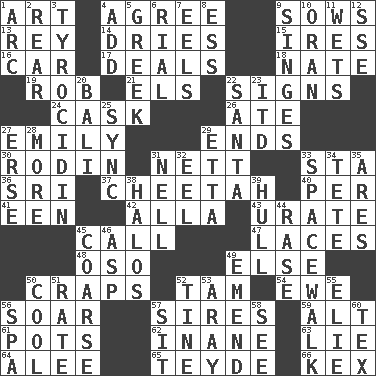 ACROSS 1. Nonscientific branch of learning 4. Match 9. Sty mamas 13. Marina Del _, California 14. Frees from moisture 15. Angers 16. Auto 17. Allots cards 18. Nathan's nickname 19. Director Reiner 21. Raised railways 22. Signals 24. Keg 26. Had dinner 27. Poet Dickinson 29. Extremities 30. "The Thinker" sculptor 31. Remaining after all deductions 33. R.R. building 36. Indian title of respect (Mr.) 37. Leopard's kin 40. For each 41. Car or cant ending 42. Silent film actress Nazimova 43. A salt of uric acid 45. Give a ring to 47. Shoestrings 48. Bear (Spanish) 49. Otherwise 50. Dice game 52. Scottish cap 54. She-sheep 56. Fly high 57. Titles for men of rank and authority 59. The first octave above the treble staff 61. Plant holders 62. Empty; void 63. Untruth 64. Toward shelter 65. Miss Universe 1986, Barbara Palacios _ 66. Dry husk or covering DOWN 1. Curve 2. Rump 3. Polypeptide antibiotic 4. Say or write further 5. Hellenic 6. Monetary unit of Yemen 7. Snakelike fish 8. Double-curved letter 9. Scorches 10. Northwest Algerian city 11. Soaks 12. Compass dir. 20. Indonesian resort city 22. Before Barbara or Clara 23. It would 25. Synchronize (abbr.) 27. Celtic language 28. Greater amount 29. Singer James 31. 1994 drama film starring Jodie Foster 32. Snakelike fish 33. High altitude stroll 34. Wig 35. Ancient Greek god of war 38. Auras 39. Frame or body of a ship 44. Raze (variant) 45. Unrefined 46. Cleo's killer 49. Make improvements or corrections to 50. Calm and collected 51. Assign a rank or rating to 52. Prong on a fork 53. Like ___ of sunshine 55. Writer Wiesel 56. Health resort 57. Be seated 58. Observe 60. John Ritter's dad