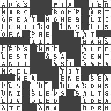 ACROSS 1. Ancient river in northeast Turkey 5. Parent Teacher Association (abbr.) 8. "___ Little Indians" 11. Drug cop 12. Frolic 14. Tate display 15. Relatively large 17. Residences 18. Cards in a Roman deck? 19. Small, flat, pigmented spot on the skin 21. Followers of ems 22. French article 23. Mouth or opening 24. Before (prefix) 25. Make lace 27. One more than two 28. Drinking establishments 31. Greek god of love 35. Compass dir. 37. Toward shelter 38. For fear that 39. Girls' org. (abbr.) 41. Penny 42. Opposed to 43. Fast jet (abbr.) 45. At sea 46. Christmas carol 47. Teat (slang) 49. Teachers' org. 51. Compass dir. 52. Ocean 55. Ichor 57. Car dealer's back yard 60. Thinks logically 62. Corn or form start 63. Bobsleighs 65. Table seasonings 66. 54 in ancient Rome 67. Margarine 68. The main thing one is thinking about 69. Had dinner 70. Santa ___, CA 71. Dormintory (informal) DOWN 1. White American of non-Hispanic descent 2. More uncommon 3. Sports stadium 4. Scram, to a cat 5. Adept person 6. Heavy book 7. So be it 8. Baron Munchausen's specialties 9. One of the Great Lakes 10. Nuclear Threat Initiatives 13. Inconspicuous attention getter 16. Native american tent (variation) 17. Weeding 20. Smile widely 26. Phillipine bananalike plant 29. French philosopher Descartes 30. Stalk of a moss capsule 31. Flair 32. Western Nevada city 33. Clearly or manifestly demonstrative 34. Vertical member of a panel or frame 36. Double-curved letter 40. Michaelmas daisies 44. Prong on a fork 48. Afternoon social gatherings 50. In addition 52. Twentieth part of a lira 53. Keyboard key 54. Indian state 55. Monetary unit of Botswana 56. A single undivided whole 58. Spanish pot 59. Adolescent 61. Expressed in words 64. ___ good deed