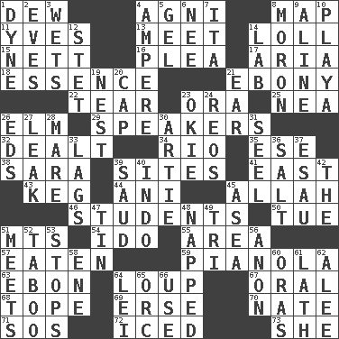 ACROSS 1. Morning condensation 4. Hindu god of fire 8. Atlas unit 11. Jacques Cousteau's middle name 13. Confront 14. Hang loosely or laxly 15. Remaining after all deductions 16. Entreaty 17. Operatic vocal solo 18. Gist 21. Black 22. Rend 23. Mouth or opening 25. Teachers' org. 26. Shade tree 29. Orators 32. Started a card game 34. _ de Janeiro 35. Compass dir. 38. "Two Mules for Sister ____" 39. Locates 41. Compass direction 43. Barrel 44. Cuckoo 45. Assad's deity 46. SAT takers 50. Third day of the wk. 51. Mountains (abbr.) 54. Wedding promise 55. Length times width 57. Ingested 59. Player piano 63. Inky black, to poets 64. Central Nebraska county 67. Taken by mouth 68. Drink excessively 69. Celtic language 70. Nathan's nickname 71. Mayday 72. On the rocks 73. A female animal or person DOWN 1. Centimeter-gram-second unit of force 2. Nights before holidays 3. Moistens 4. Electrical Unit 5. Set 6. Born 7. Call ___ day 8. Person of subnormal intelligence 9. Place in a line 10. Beach, in Buenos Aires 12. Proofreading order 14. Experiment locale 19. A home for chicks 20. Head covering 21. Hearing organ 23. Migrant worker of the '30s 24. Vintage cars 26. Begley and Asner 27. Path through which fluid escapes 28. Female horse 30. Nick name for Arthur 31. Sew up the eyelids of hawks and falcons 33. Fails to keep up a pace 36. Table seasoning 37. He sold his birthright 39. Saudi Arabian king (1953-1964) 40. Southeast Asian peninsula 42. Definite Article 45. At sea 47. Metal container 48. Slept 49. Three (prefix) 51. Confronts 52. Off limits 53. Discontinues 56. Soon (poet.) 58. Compass dir. 60. Mouths or openings 61. Thin strip of wood or metal 62. Toward shelter 64. Flowery wreath 65. The grampus (Milton) 66. Purpose