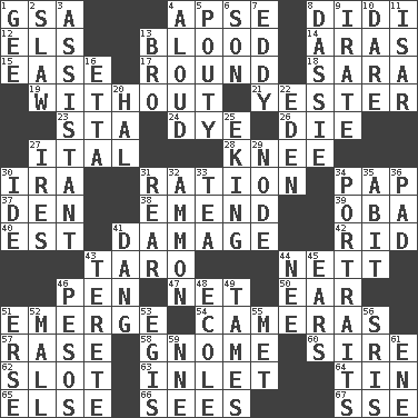 ACROSS 1. Girls' org. (abbr.) 4. Domed church section 8. "You Light Up My Life" star Conn 12. Raised railways 13. Vital fluid 14. Caspian sea tributary 15. Comfort 17. Unit of ammunition 18. "Two Mules for Sister ____" 19. Sans 21. Of or pertaining to yesterday 23. R.R. building 24. Color 26. Pass on 27. Slanted text style (abbr.) 28. Leg joint 30. Lyricist Gershwin 31. Food allowance for one day 34. Infant food 37. Lair 38. Make improvements or corrections to 39. Chief or king in Benin or Nigeria 40. Eastern Standard Time (abbr.) 41. Break 42. To free from 43. Edible starchy tuberous root 44. Remaining after all deductions 46. Writing instrument 47. Fish or hair follower 50. Hearing organ 51. Develop 54. Devices for capturing images 57. To erase 58. Dwarf 60. Male parent of an animal 62. Groove 63. An arm off of a larger body of water 64. Shallow baking pan 65. Otherwise 66. Observes 67. Compass dir. DOWN 1. Unit of force equal to gravity 2. Cole _ (cabbage dish) 3. Aide 4. Verbally 5. Inclined to pout 6. Manchild 7. Whirlpool 8. Small ungulate mammals of Africa 9. Feeling or showing extreme anger 10. Have the gumption 11. Austrian river, tributary to the Danube 13. Sis' sibling 16. Singer James 20. Actor Linden 22. Paradise 25. Supplementing with great effort 27. Angers 29. Thickened enlargement 30. Binary compound 31. Tail end 32. ID or VA city 33. Beverage made from leaves 34. Likenesses of persons 35. "This won't hurt ____!" 36. Groovy apt. 41. Mild oath, euphamism for damn 43. Cylindrical with tapered ends 44. Born 45. Hearing organs 46. Mexican monetary units 48. Learning spot: Fr. 49. Domesticates 51. Celtic language 52. Promenade 53. Armor plate that protects the chest 55. Was introduced to 56. Indian titles of respect 59. Compass dir. 61. Compass dir.