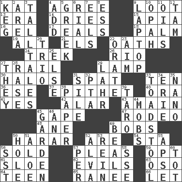 ACROSS 1. Krazy ___ of comics 4. Match 9. Spoils 13. Period 14. Frees from moisture 15. Capital of Western Samoa 16. Set 17. Allots cards 18. Inside of hand 19. Keyboard modifier key 21. Raised railways 22. Curses 24. Long journey 26. River (Sp.) 27. Lag or linger behind 29. Desk light 30. Auras 31. Petty quarrel 33. "___ Little Indians" 36. Compass dir. 37. Curse 40. Mouth or opening 41. Affirmative reply 42. Having or resembling wings 43. With great haste 45. Yawn 47. Cowboy competition 48. A saturated hydrocarbon 49. Moves up and down 50. Ethiopian city, capital of Harari 52. "We ___ not amused" (Victoria) 54. R.R. building 56. Disposed of to a purchaser 57. Entreaties 59. Elect 61. _ gin 62. Vices 63. Bear (Spanish) 64. Adolescent 65. Indian princess (variant) 66. Allow DOWN 1. Barrel 2. Length times width 3. Baron Munchausen's specialties 4. Increase 5. Hellenic 6. Monetary unit of Yemen 7. Snakelike fish 8. Double-curved letter 9. Portable computer 10. Brightly colored fish 11. Lubricates 12. Scottish cap 20. Musical group of three 22. Declaim 23. Direct toward a target or goal 25. Otherwise 27. Those things 28. To erase 29. Cowardly lion portrayer 31. Drop; flow; fall 32. Parent Teacher Assoc. 33. Inedible or poisonous agaric 34. 4th largest of the Great Lakes 35. Billionth: prefix 38. Some stationery 39. Edible starchy tuberous root 44. Crowds into 45. Place where plants grow 46. Santa ___, CA 49. Memphis, Tenn. Street 50. Opening into or through something 51. Medicinal plant 52. Inventor's middle name 53. It's straight from the horse's mouth 55. Domed church section 56. Fast jet (abbr.) 57. For each 58. Compass dir. 60. Small child