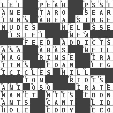 ACROSS 1. Allow 4. Lightbulb-shaped fruit 8. Inconspicuous attention getter 12. One (Scot) 13. Edible starchy tuberous root 14. Singe 15. Taverns 17. Type of rug 18. Scorch 19. Unclothed pictures 21. Cartoonist voice _ Blanc 23. Compass dir. 24. Small island 26. ___ Haven, CT 28. Nourish 30. Inveterate users 34. White ___ sheet 37. Ancient river in northeast Turkey 39. Famous astronaut Armstrong 40. Tired old horse 41. Wash lightly 43. Retirement account (abbr.) 44. Metal containers 46. Dutch treat 47. Part of a journey 48. Winter's stalactites 51. Place where flour is made 54. Electrically charged atom 55. Disturbances 58. Cuckoo 61. Bear (Spanish) 63. Feeling or showing extreme anger 65. French painter Edouard 67. Nuclear Threat Initiatives 71. Inky black, to poets 72. Pismires 73. Patter 74. Hat (slang) 75. Opening into or through something 76. Whirlpool 77. Environmental prefix DOWN 1. (Had) reclined 2. World-weariness 3. Looks after 4. Parent Teacher Assoc. 5. Hearing organ 6. "We ___ not amused" (Victoria) 7. Wander aimlessly 8. Air pressure measure (abbr.) 9. Elected reps. 10. Settles 11. Woody plant 16. Itself 18. Downhill vehicle 20. Observe 22. Conclude 25. Pull apart 27. Victory 29. Frees from moisture 30. Indian state 31. To provide with a ceiling 32. Hoop that covers a wheel 33. Volcanic refuse 34. Against 35. Ketch in the Levant 36. Hindu god of fire 38. Also 42. Independent ruler or chieftain 45. _-fi 49. Plunder 50. Followers of ems 52. Cards in a Roman deck? 53. Old wives' tales, e.g. 56. Eating place 57. Unemotional 58. Nanny 59. Billionth: prefix 60. International (abbr.) 62. Single time 64. Inside; within (prefix) 66. Compass dir. 68. Bit 69. Indiana (abbr.) 70. Filthy place