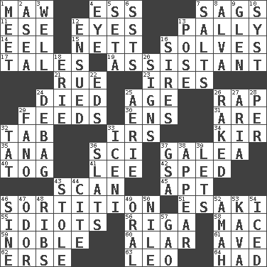 ACROSS 1. Opening into something insatiable 4. Curvy letter 7. Sinks 11. Compass dir. 12. Sight organs 13. Chummy 14. Snakelike fish 15. Remaining after all deductions 16. Finds the solution 17. Lies 19. Helper 21. Regret 23. Angers 24. Passed on 25. Ripen 26. Hit sharply and swiftly 29. Eats 30. Followers of ems 31. "We ___ not amused" (Victoria) 32. Bar bill 33. Big collection agency 34. Apertif with cassis 35. Santa ___, CA 36. _-fi 37. An organ shaped like a helmet 40. Coat; cloak 41. Area sheltered from the wind 42. Drove too fast 43. Examine minutely or intensely 45. Fitting 46. Conclusion 51. 1973 Nobel Price Winner (Physics) Leo 55. Foolish or stupid persons 56. Capital of Latvia 58. Big _ 59. Having high moral qualities 60. Having or resembling wings 61. "___ Maria" 62. Celtic language 63. Lion 64. Possessed DOWN 1. Rendezvous 2. At sea 3. Not ill 4. Sight organ 5. Bristle 6. Fast planes 7. Table seasonings 8. Inventor's middle name 9. Small, secluded valley 10. System (abbr.) 12. Took place subsequently 13. Airs 16. Titles for men of rank and authority 18. One of the Great Lakes 20. Public displays of written messages 22. Begley and Asner 24. Debunk (Brit. slang) 25. Nest on high 26. Swept the length of 27. Roberta Peters solo 28. For each 29. Papal veil 32. Make lace 33. Ancient Celtic tribe of eastern Britain 36. Narrow boards 37. Girls' org. (abbr.) 38. Seem 39. Allows 43. Fur scarf 44. Quote 46. Trig term 47. Scent 48. Chest bones 49. Spoken 50. The longest river in the world 52. Wet nurse 53. Polynesian shrub of the pepper family 54. On the rocks 57. E Mali city