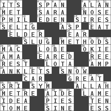 ACROSS 1. It is 4. Connect, as a bridge 8. ____ Jay Lerner 12. Was introduced to 13. "Two Mules for Sister ____" 14. Olfactory organ 15. Silvers or Donahue 17. Locale of original sin 18. Fathers 19. Major League Baseball Commissioner Bud 21. Cleo's killer 23. Erode 24. A person who is older than you are 26. Ewer handle 28. Strike heavily 30. Modes 34. Big _ 37. Ear part 39. Migrant worker of the '30s 40. Wet nurse (var.) 41. Having ears or earlike features 43. To riddle 44. Relief 46. Globular water bottle used in Asia 47. Electrical Unit 48. Short socks 51. Overwhelm 54. Auto 55. Relatively large 58. Indian title of respect (Mr.) 61. Symbol (abbr.) 63. Assad's deity 65. Distance measurement (Brit.) 67. Assistant 71. Unable to walk 72. The main thing one is thinking about 73. Sliced desserts 74. "___ Little Indians" 75. Heavy book 76. Trig term 77. Double-curved letter DOWN 1. Naughty children 2. Giggle 3. Free of sound 4. Compass dir. 5. Groovy apt. 6. "We ___ not amused" (Victoria) 7. Nanny 8. Black tropical American cuckoo 9. Old wives' tales, e.g. 10. Toward the sea 11. Egg locale 16. Hats (slang) 18. Argument over a trivial matter 20. Set 22. Observe 25. General guideline 27. 17th letter of the Greek alphabet 29. Scores awarded for successful feats 30. Confronts 31. Gumbo ingredient 32. South Vietnam president (1954) 33. Ooze 34. Hindu Mythology: god of death 35. So be it 36. Keg 38. Sis' sibling 42. Mild oath, euphamism for damn 45. Affectionate concern, for short 49. Comfort 50. Attempt to accomplish something 52. Mouth or opening 53. Water source 56. Having winglike extensions 57. Corrects by punishment or discipline 58. Stricken, poetically 59. Redecorate 60. A whole individual unit 62. Atlas contents 64. Coop moms 66. Actress Charlotte 68. One more than two 69. Lair 70. Compass dir.