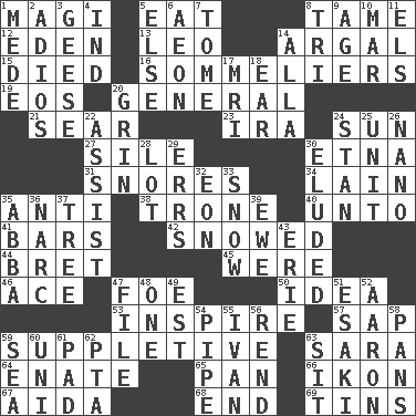 ACROSS 1. Wise men 5. Ingest 8. Docile 12. Paradise 13. Lion 14. Therefore, facetiously 15. Passed on 16. Wine waiters 19. Greek goddess of the dawn 20. Commissioned military rank 21. Burn superficially 23. Retirement account (abbr.) 24. Player for Phoenix 27. Filth; sediment 30. Inactive volcano in Sicily 31. Sounds asleep 34. (Had) reclined 35. Opposed to 38. Heavy duty weighing machine 40. To (old English) 41. Taverns 42. Frozen precipiation fell 44. Cy Young winner Saberhagen 45. We are 46. Adept person 47. Enemy 50. The content of cognition 53. Stimulate to action 57. Plant excrement 59. Supplying deficiencies 63. "Two Mules for Sister ____" 64. Related on the mother's side 65. Baking dish 66. Image 67. Opera by Verdi 68. Conclude 69. Canisters DOWN 1. Ancient Persian 2. Goodbye (Sp.) 3. Honkers 4. Working for oneself (abbr.) 5. Otherwise 6. A really long time 7. Heavy book 8. Three (prefix) 9. Grow older 10. Spoil 11. Raised railways 14. Silent film actress Nazimova 17. Medical imaging device (abbr.) 18. Ewer handle 20. Amused look 22. Help 24. Comedian Laurel of Laurel & Hardy 25. A single undivided whole 26. Billionth: prefix 28. Car dealer's back yard 29. Blunders 30. Dodged 32. Period of immesurable duration 33. Frozen precipitation 35. Swedish rock group 36. Drug cop 37. Family _ (genealogy) 39. She-sheep 43. 4th largest of the Great Lakes 47. Do some clerical work 48. Single 49. Eastern Standard Time (abbr.) 51. 1973 Nobel Price Winner (Physics) Leo 52. Composer Copland 54. Corncob 55. "Terrible" tsar 56. Tear apart 58. Baking dishes 59. Ocean 60. Single; one (prefix) 61. Groovy apt. 62. Parent Teacher Association (abbr.) 63. Be seated