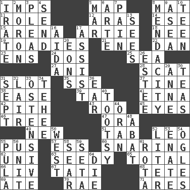 ACROSS 1. Naughty children 5. Atlas unit 8. Floor protector 11. Hero or heavy, e.g. 12. Ancient river in northeast Turkey 14. Compass dir. 15. Sports stadium 17. Nick name for Arthur 18. Born 19. Sycophants 21. Compass dir. 22. Daniel's nick name 23. Followers of ems 24. Two (Sp.) 25. Ocean 27. Black tropical American cuckoo 28. Get outta here! 31. Position in a hierarchy or organization 35. Compass dir. 37. Prong on a fork 38. Relaxation 39. Make lace 41. Inactive volcano in Sicily 42. Essential or central part 43. Friend of Pooh 45. Sight organs 46. Relationship diagram 47. Mouth or opening 49. ___ Haven, CT 51. Bar bill 52. Lion 55. Tenth month of the Hindu calendar 57. Double-curved letter 60. Catching in a trap 62. University (slang) 63. Full of seeds 65. "_____ Recall" 66. 54 in ancient Rome 67. Jacques of French films 68. Wig 69. Had dinner 70. Actress Charlotte 71. Ancient Greek god of war DOWN 1. Feeling or showing extreme anger 2. Person of subnormal intelligence 3. Entreaties 4. Post 5. Third mo. 6. Johnson of "Laugh-In" 7. Ache 8. Ananias' fault 9. At sea 10. Adolescent 13. Perceives with the eye 16. Opera by Verdi 17. Aid 20. Immeasurably long periods of time 26. First name in cosmetics 29. Queen of England 1702-14 30. Beverages made from leaves 31. Back-to-school mo. 32. Den 33. Clearly or manifestly demonstrative 34. Giggle 36. Hearing organ 40. Tootsie (variant) 44. NW Algerian seaport 48. Blind as ____ 50. 270 degrees 52. 61 cubic inches 53. Maternal 54. Stares 55. Monetary unit of Botswana 56. A single undivided whole 58. Scorch 59. Bristle 61. Round or rotation of duties 64. Pass on