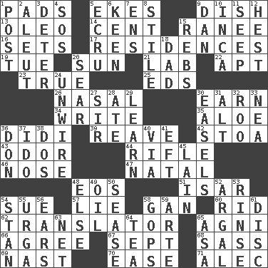 ACROSS 1. Groovy apts. 5. Supplements with great effort 9. Food container 13. Margarine 14. Penny 15. The wife of a rajah (variant) 16. Puts into a specified state 17. Homes 19. Third day of the wk. 20. Player for Phoenix 21. Experiment locale 22. Fitting 23. Loyal 25. Begley and Asner 26. Rhinal 30. Merit 34. Compose 35. Medicinal plant 36. "You Light Up My Life" star Conn 39. Rob, plunder, or pillage 42. Portico 43. Scent 44. Firearm 46. Sense of smell 47. Brizilian seaport 48. Greek goddess of the dawn 51. Austrian river, tributary to the Danube 54. Institute legal proceedings 57. Falsehood 58. Separate the seeds from cotton 60. To free from 62. Interpreter 65. Hindu god of fire 66. Match 67. Back-to-school mo. 68. Backtalk 69. Political cartoonist Thomas 70. Relaxation 71. Actor Baldwin DOWN 1. Mail 2. Eskimo relative 3. Prevent from occurring 4. Mayday 5. Shade of tan 6. Peachy ____! 7. Followers of ems 8. Vertical member of a panel or frame 9. One of the 12 tribes of Israel 10. South American Indian 11. Ooze 12. Behest 15. Confederate soldiers (slang) 18. Male parent 20. Dry up 24. Undo the wiring of 27. Title for a knight 28. Had dinner 29. Acquire or gain knowledge or skills 30. Artist's stands 31. The first octave above the treble staff 32. Friend of Pooh 33. Teachers' org. 36. Spanish title 37. Wedding promise 38. Two (Sp.) 40. By way of 41. Lizard (obsolete) 45. (Had) reclined 48. Otherwise 49. Petroleum 50. Gospel singer Marvin 52. Therefore, facetiously 53. Wash lightly 54. Comedian Laurel of Laurel & Hardy 55. Capital and largest city of Mongolia 56. Hearing organs 58. Republicans 59. Johnson of "Laugh-In" 61. Plate 63. Fish or hair follower 64. Afternoon social gathering 65. White ___ sheet