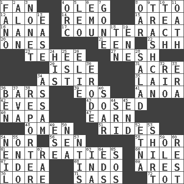 ACROSS 1. Avid follower 4. Cassini of fashion 8. "Beetle Bailey" pooch 12. _ vera 14. San ____ (Riviera town) 15. Length times width 16. Grandmother 17. Act in opposition 20. Washington bills 21. Car or cant ending 22. Quiet! 23. Giggle 27. Soft 29. Small island 31. 1/640 square mile 34. Being in motion 35. Den 36. Long, evenly shaped pieces 39. Greek goddess of the dawn 41. Small Philippine buffalo 42. Nights before holidays 43. Administered medicine 46. California wine valley 47. Merit 48. Presage 51. Amusement-park features 54. And not 56. Elected rep. 58. Son of Odin 61. Pleas 66. The longest river in the world 67. The main thing one is thinking about 68. _ china 69. Ancient Greek god of war 70. Old wives' tales, e.g. 71. Backtalk 72. Small child DOWN 1. Papal veil 2. ____ Jay Lerner 3. Music written for nine 4. The grampus (Milton) 5. Lion 6. Australian flightless bird 7. Went 8. Rowing implement 9. File 13 10. Technician 11. Pledge 13. Relaxation 18. Nine, plus one 19. Compass dir. 24. Part of HMS, perhaps 25. Eastern Standard Time (abbr.) 26. Writer Wiesel 28. Vegetable dish 30. Wear away 32. River (Sp.) 33. Period 34. Indian state 36. Benjamin's nick name 37. Actress Gardner 38. Newsperson 40. Fly high 44. Indian title of respect (Mr.) 45. Conclude 49. Compass dir. 50. Teachers' org. 52. Inactive volcano in Sicily 53. Chest covering 54. Famous astronaut Armstrong 55. Southwest Nigerian state 57. Nuclear Threat Initiatives 59. Margarine 60. Relief 62. Actress Charlotte 63. _ tizzy (2 wds.) 64. Begley and Asner 65. Distress signal