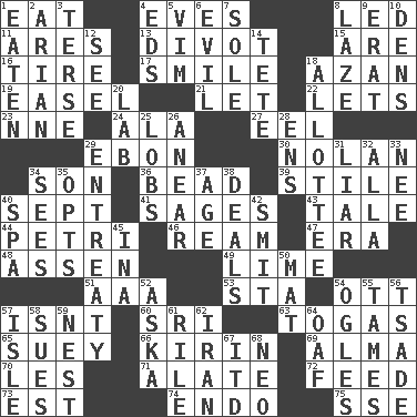 ACROSS 1. Ingest 4. Nights before holidays 8. Directed 11. Ancient Greek god of war 13. A piece of turf (Scot.) 15. "We ___ not amused" (Victoria) 16. Hoop that covers a wheel 17. Grin 18. Muslim summons to prayer 19. Artist's stand 21. Allow 22. Allows 23. Compass dir. 24. Chicken ___ king 27. Snakelike fish 29. Inky black, to poets 30. Pitcher Ryan 34. Manchild 36. Necklace unit 39. Vertical member of a panel or frame 40. Back-to-school mo. 41. Gurus 43. Falsehood 44. _ dish (used to culture cells) 46. 480, 500 or 516 sheets of paper 47. Period 48. NE Netherlands city 49. Welles in "The Third Man" 51. Auto club (abbr.) 53. R.R. building 54. Baseball player Mel 57. Is not 60. _ Lanka 63. Ancient Roman robes 65. Chop _ 66. Japanese brewing company 69. _ mater 70. French article 71. Having winglike extensions 72. Nourish 73. Eastern Standard Time (abbr.) 74. Inside; within (prefix) 75. Compass dir. DOWN 1. Consumed 2. Believer in; advocate of (suffix) 3. Laconic 4. Begley and Asner 5. Zeal 6. Tending to cause great harm 7. Not divided or shared with others 8. Goldbrick 9. Part of Q.E.F. 10. Lairs 12. Perceive with the eye 14. Wig 18. One to whom something is allotted 20. Experiment locale 25. Tennis shots 26. Approach 28. Followers of ems 29. Plea 31. One who doesn't tell the truth 32. Silent film actress Nazimova 33. Born 34. Observes 35. Elects 37. Mature 38. Allots cards 40. Health resort 42. Stricken, poetically 45. _ tizzy (2 wds.) 50. Floor protector 52. "____ silly question..." 54. Stares 55. Makes less strong or intense 56. Sadhe (variant) 57. Small island 58. Institutes legal proceedings 59. A home for chicks 61. Cause heat under the collar 62. SW Asia republic 64. Clumsy lout 67. It would 68. Modern: prefix