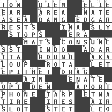 ACROSS 1. Pull behind 4. South Vietnam president (1954) 8. Writer Wiesel 12. Hearing organ 13. Type of rug 14. Nathan's nickname 15. At sea 17. Mild oath, euphamism for damn 18. _ Allan Poe 19. Musical pauses 21. _ tizzy (2 wds.) 23. Insidious 24. Constricts 26. Period 28. Floor protectors 30. Eat 34. Fast jet (abbr.) 37. _ china 39. The sixth month of the Jewish calendar 40. Call ___ day 41. Having a circular shape 43. Alias (abbr.) 44. Central Nebraska county 46. Round or rotation of duties 47. Allow 48. Curse 51. To be drawn or hauled along 54. The 18th letter of the Arabic alphabet 55. Maternal 58. Elect 61. Lair 63. To the left, to Queeg 65. Give a jingle 67. Canvas cover 71. Inactive volcano in Sicily 72. Become fatigued 73. Angers 74. Atmosphere 75. Position in a hierarchy or organization 76. Proofreading order 77. Lion DOWN 1. Pull apart 2. Fertile tracts in a desert 3. Obtain by seizing forcibly or violently 4. June honoree 5. Retirement account (abbr.) 6. Car or cant ending 7. Wise men 8. Conclusion 9. Fails to keep up a pace 10. Slanted text style (abbr.) 11. Suggestive of the supernatural 16. Tiny particle 18. Merit 20. Health resort 22. Modern: prefix 25. Use a swizzle stick 27. White ___ sheet 29. Derisive sound 30. Continued (abbr.) 31. Hereditary estate 32. Cause to be 33. Part of Q.E.F. 34. Drop; flow; fall 35. Cease 36. "Change" in Tahitian 38. Superhero pair 42. Have the gumption 45. Parent Teacher Association (abbr.) 49. Flintstone garb 50. Compass dir. 52. Santa ___, CA 53. Open wide 56. Add up to 57. Bert's buddy 58. Elects 59. Silvers or Donahue 60. "Corrida" creature 62. Nuclear Threat Initiatives 64. Pacific island yam 66. Fish or hair follower 68. Tate display 69. To riddle 70. Pacific Standard Time (abbr.)