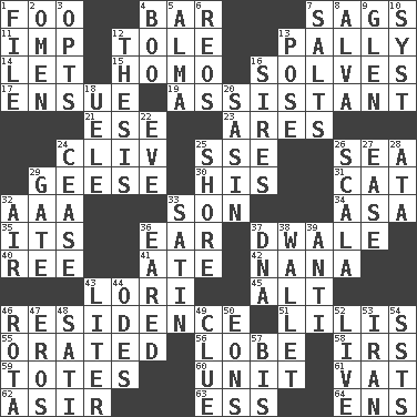ACROSS 1. Egg _ yung 4. Oblong piece of solid material 7. Settles 11. Mischievous child 12. Lacquered or enameled metalware 13. Chummy 14. Allow 15. Same (prefix) 16. Finds the solution 17. Take place subsequently 19. Aide 21. Compass dir. 23. Ancient Greek god of war 24. 154 in Roman numerals 25. Compass dir. 26. Ocean 29. Honkers 30. Part of HMS, perhaps 31. Domesticated feline 32. American Automobile Association (abbr.) 33. Boy, to dad 34. White ___ sheet 35. It is 36. Hearing organ 37. A sleeping potion; an opiate (poet.) 40. To riddle 41. Had dinner 42. Nanny 43. Australian parrot (variant) 45. Keyboard modifier key 46. Dwelling 51. Ms. Damita and namesakes 55. Declaimed 56. Ear part 58. Big collection agency 59. Hauls 60. A single undivided whole 61. Large container 62. SW Saudi Arabia district 63. Curvy letter 64. Followers of ems DOWN 1. Do some clerical work 2. Presage 3. Chooses 4. Sometimes accompanies a hiss 5. _ mater 6. Vintage cars 7. Table seasonings 8. Inventor's middle name 9. Small, secluded valley 10. System (abbr.) 12. College paper 13. Airs 16. Male parents of animals 18. Ubangi River tributary 20. Indian antelope 22. Night before a holiday 24. Desist 25. Dinah or Pauly 26. Any of the three canals of the cochlea 27. Comfort 28. _ moment's notice (2 wds.) 29. Yard entry 32. Atmosphere 33. Smooth fabric 36. Having ears or earlike features 37. Heredity factor (abbr.) 38. Place for singles 39. Against 43. 61 cubic inches 44. Lyric poems 46. Roll call or roster of names 47. Greek god of love 48. Suttee (variant) 49. A slight indication 50. Immeasurably long periods of time 52. Moving, as bait 53. SW Asia republic 54. Fast planes 57. Again