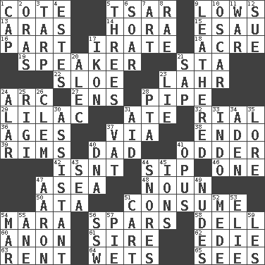 ACROSS 1. ____ d'Azur (French Riviera) 5. Russian ruler of old 9. Moos 13. Caspian sea tributary 14. Israeli folk dance 15. Son of Isaac 16. Piece 17. Feeling or showing extreme anger 18. 43,560 square feet 19. Orator 21. R.R. building 22. A type of plum 23. Cowardly lion portrayer 24. Curve 27. Followers of ems 28. Corncob 29. Pale purple color 31. Had dinner 32. Monetary unit of Yemen 36. Eras 37. By way of 38. Inside; within (prefix) 39. Basketball hoops 40. June honoree 41. More peculiar 42. Is not 44. Small drink 46. Single 47. Toward the sea 48. Part of speech 50. _ moment's notice (2 wds.) 51. Ingest 54. Hindu Mythology: god of death 56. Practice fights 58. Small valley 60. Soon (poet.) 61. Title for a man of rank and authority 62. Singer Brickell 63. Monthly bill 64. Moistens 65. Observes DOWN 1. Head covering 2. Mouths or openings 3. Canvas cover 4. _____ Park, CO 5. Trios 6. Fly high 7. Nonscientific branch of learning 8. Actress Charlotte 9. Tough but pliablecoriaceous 10. Witty Wilde 11. Armed conflict 12. Take to court 17. Visual representation of an object 20. Actor Baldwin 21. Plant excrement 23. Falsehood 24. Having or resembling wings 25. Swiss mountan, "Queen of the Mountains" 26. Clement's nick name 28. Parent Teacher Assoc. 30. Aide 31. Assist 33. _ china 34. An important port of Yemen 35. Old wives' tales, e.g. 37. Large container 40. Heredity factor (abbr.) 41. Musical composition 43. Ocean 44. Sounds asleep 45. Charged atoms 47. Composer Copland 49. Unadorned figures 51. Heavy open wagon 52. Ancient Persian 53. Writer Wiesel 54. Make imperfect 55. One (Scot) 56. Compass dir. 57. Sliced dessert 59. French article