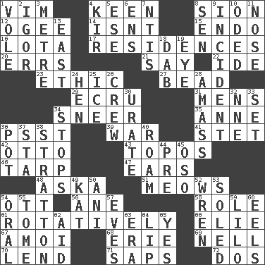 ACROSS 1. Zeal 4. Peachy ____! 8. The Jewish people; Israel 12. Double curve, resembling the letter S 14. Is not 15. Inside; within (prefix) 16. Globular water bottle used in Asia 17. Dwellings 20. Blunders 21. Declare 22. Binary compound 23. Principle of right and wrong 27. Necklace unit 29. Shade of tan 31. Not women's 34. Scornful expression 35. Singer Murray 36. Inconspicuous attention getter 39. Armed conflict 41. Proofreading order 42. Von Bismarck 43. Traditional theme or motif 46. Canvas cover 47. Hearing organs 48. "____ silly question..." 51. Catcalls? 54. Baseball player Mel 56. A saturated hydrocarbon 58. Hero or heavy, e.g. 61. Happening in regular succession 66. Writer Wiesel 67. Mine, in Marseilles 68. 4th largest of the Great Lakes 69. 1994 drama film starring Jodie Foster 70. Grant temporary use of 71. Plant excrements 72. Two (Sp.) DOWN 1. Grand slam 2. Russian composer Stravinsky 3. Distance measurement (Brit.) 4. Apertif with cassis 5. Compass dir. 6. Followers of ems 7. Nuclear Threat Initiatives 8. Elected rep. 9. Happening 10. Wrote a lyric poem 11. Sense of smell 13. Compass direction 18. Pat or tap gently 19. Sight organ 24. Layer 25. Frozen water 26. Group working together 28. Collect or gather 30. A salt of uric acid 32. Compass dir. 33. Put into a specified state 34. Closes up, plugs up 36. Plant holder 37. R.R. building 38. Ski resort town in Vermont 40. Wander 44. Before (prefix) 45. Bear (Spanish) 49. Krazy ___ of comics 50. Black tropical American cuckoo 52. Songbird 53. Having a sole or soles 54. Taken by mouth 55. Heavy book 57. Nights before holidays 59. _ and Stitch 60. Snakelike fish 62. Help 63. Period 64. Mouth edge 65. Affirmative reply