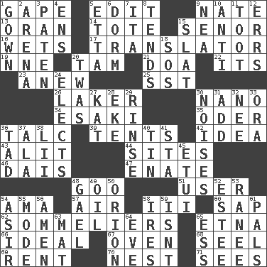 ACROSS 1. Stare wonderingly 5. Prepare for publication 9. Nathan's nickname 13. NW Algerian seaport 14. Lug 15. Sir (Sp.) 16. Soaks 17. Interpreter 19. Compass dir. 20. Scottish cap 21. ___ good deed 22. ___ a Wonderful Life 23. Afresh 25. Fast jet (abbr.) 26. Member of a famous L.A. basketball team 30. Billionth: prefix 34. 1973 Nobel Price Winner (Physics) Leo 35. Baltic tributary 36. Baby powder 39. Portable shelters 42. The main thing one is thinking about 43. Came down and settled, as after flight 44. Locates 46. Raised platform 47. Maternal 48. Thick or sticky substance 51. One who uses or employs something 54. Nursemaid (var.) 57. Wind 58. One more than two 60. Plant excrement 62. Wine waiters 65. Inactive volcano in Sicily 66. Perfect 67. Baking chamber 68. Stitch closed the eyes of (a falcon) 69. Monthly bill 70. A home for chicks 71. Observes DOWN 1. Bride's dress 2. Sports stadium 3. Eucharist need 4. Followers of ems 5. Singer James 6. Dormintory (informal) 7. Call ___ day 8. Is inclined (to) 9. Teachers' org. 10. Opposed to 11. A blast of a horn 12. Blunders 15. Narrow board 18. Mayday 20. It was, poetically 24. Chooses 27. Krazy ___ of comics 28. Make supply last 29. Remove soap 30. Annoying sounds 31. Say or write further 32. Born 33. Mouth or opening 36. Small boy 37. Insect wing 38. Cards in a Roman deck? 40. Shallow baking pan 41. R.R. building 45. Needle holder 48. Highlander 49. Petroleum 50. Greek mythologigal hunter 52. First name in cosmetics 53. The wife of a rajah (variant) 54. SW Saudi Arabia district 55. Method 56. So be it 58. Angers 59. Is not 61. Friends 63. Floor covering 64. Night before a holiday 65. Double-curved letter