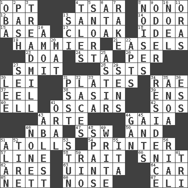 ACROSS 1. Elect 4. Russian ruler of old 8. Words to Nanette 12. Drinking establishment 13. Before Barbara or Clara 14. Scent 15. Toward the sea 17. Cover or conceal 18. The main thing one is thinking about 19. More given to overacting 21. Artist's stands 23. ___ good deed 24. R.R. building 26. For each 27. Stricken, poetically 28. Fast planes 30. Luau accessory 31. Food holders 34. Actress Charlotte 37. Snakelike fish 38. Indian antelope 39. Followers of ems 40. Pipe bend 41. Motion picture awards 42. Mayday 43. Johnson of "Laugh-In" 44. Greek goddess of the earth (variant) 46. Basketball assoc. 47. Compass dir. 50. Added to 51. Ringlike coral islands and reefs 54. Hard copy producer 57. Actor's bit 58. Distinguishing feature 60. In a ____ (agitated or irritated) 62. Ancient Greek god of war 63. National forest in Provo, Utah 64. 4-wheeled motor vehicle 65. Remaining after all deductions 66. Sense of smell 67. Biblical high priest DOWN 1. Chief or king in Benin or Nigeria 2. Romantic infatuation 3. Excercise machine 4. Stories 5. Derisive sound 6. _ moment's notice (2 wds.) 7. Immoral or dissolute person 8. Annoying sounds 9. More peculiar 10. Christmas carol 11. Mouths or openings 13. _-fi 16. Mine, in Marseilles 20. Floor protector 22. Tenement units (abbr.) 25. Moving about 27. Stitch closed the eyes of (a falcon) 29. Elected reps. 30. Area sheltered from the wind 31. Inconspicuous attention getter 32. Shoestrings 33. White ___ sheet 34. Home 35. Small Philippine buffalo 36. Curvy letter 41. Taken by mouth 43. Most capable 44. Separate the seeds from cotton 45. Pismires 46. Music written for nine 48. Connects, as a bridge 49. Compose 51. ____ Jay Lerner 52. Become fatigued 53. Make senseless or dizzy 55. Call ___ day 56. Monetary unit of Yemen 59. _ de Janeiro 61. Three (prefix)