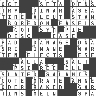 ACROSS 1. Sep. follower 4. Stalk of a moss capsule 8. Hiding places for outlaws 12. Attempt 13. Middle Eastern gold or silver currency 14. At sea 15. Become fatigued 17. Native American of Southwest Alaska 18. Comedian Laurel of Laurel & Hardy 19. Mood resulting from idleness 21. Artist's stands 23. Small bed 24. Symbol (abbr.) 26. Sliced dessert 27. Plate 28. Relaxation 30. Writing tablet 31. Break 34. Heredity factor (abbr.) 37. _ Lanka 38. Silly 39. Armed conflict 40. Nine, plus one 41. Chooses 42. Compass dir. 43. Silent film actress Nazimova 44. Table seasoning 46. 23rd letter of the Greek alphabet 47. Portuguese money of account (variant) 50. Pipe bend 51. Scheduled 54. Deli grouping 57. ____ d'Azur (French Riviera) 58. Speak pompously 60. Queen of England 1702-14 62. Baltic tributary 63. Moved through 64. Slender fish 65. Canisters 66. Chow _ 67. Health resort DOWN 1. Baseball player Mel 2. Baby bed with high sides 3. Polypeptide antibiotic 4. Grain storage towers 5. Foe 6. The 19th letter of the Greek alphabet 7. Johnson of "Laugh-In" 8. Hyrax 9. First name in cosmetics 10. Be tempered by heat 11. Without 13. Male parent 16. Greek god of love 20. And so on (abbr.) 22. Domed church section 25. Intended 27. Have the gumption 29. Grows older 30. Pacific Standard Time (abbr.) 31. Deli pickle 32. Approach 33. Big _ 34. Residences 35. Political cartoonist Thomas 36. "We ___ not amused" (Victoria) 41. Writer Wiesel 43. Michaelmas daisies 44. Ocean 45. _ mater 46. Eucharist need 48. 1973 Nobel Price Winner (Physics) Leo 49. Ingested 51. Highlander 52. Farming town in central California 53. Dormintory (informal) 55. Directed 56. Fastener 59. Actress Charlotte 61. Epoch