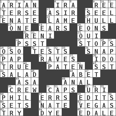 ACROSS 1. Believer in; advocate of (suffix) 6. Retirement account (abbr.) 9. Portuguese money of account (variant) 12. Laconic 13. SW Saudi Arabia district 14. Stitch closed the eyes of (a falcon) 15. Maternal 16. Unable to walk 17. Frame or body of a ship 18. Single 19. Hearing organs 20. Immeasurably long periods of time 21. Painter Guido (1575-1642) 23. Fr. "Yes" 24. Inconspicuous attention getter 25. Closes up, plugs up 28. Bear (Spanish) 30. Trials 34. Fastener 35. Infant food 36. All-night dance parties 38. Wedding promise 39. Loyal 41. Eucharist need 43. Fast jet (abbr.) 44. Vegetable dish 46. Collude with 48. White ___ sheet 49. Of or related to the anus 50. Ship's personnel 51. Smile enhancers 53. RI univ. 56. Silvers or Donahue 57. Blunders 58. Prepares for publication 60. Puts into a specified state 61. Nathan's nickname 62. Viva Las _ 63. Attempt to accomplish something 64. Color 65. Peak District village in England DOWN 1. Had dinner 2. Former U.S. Attorney General Janet 3. SW Asia republic 4. Michaelmas daisies 5. Born 6. Austrian river, tributary to the Danube 7. Basketball hoops 8. "We ___ not amused" (Victoria) 9. One who advocates reunion 10. Snakelike fish 11. Pipe bend 13. Jai ____ 14. Yells 19. Keyboard key 20. Greek goddess of the dawn 22. Eastern Standard Time (abbr.) 24. Teen's desire 26. Groovy apts. 27. Specific locale 28. Elects 29. "Two Mules for Sister ____" 31. Plant excrement 32. Federal power corp. 33. Put into a specified state 37. Seines 40. Artist's stands 42. Basketball assoc. 45. Simpleton 47. Evaded 49. Domed church section 50. "Mermaids" star 51. Supercomputer manufacturer 52. Johnson of "Laugh-In" 54. Capital of Latvia 55. Slanted text style (abbr.) 56. Pacific Standard Time (abbr.) 57. Conclusion 58. First lady 59. Compass dir.