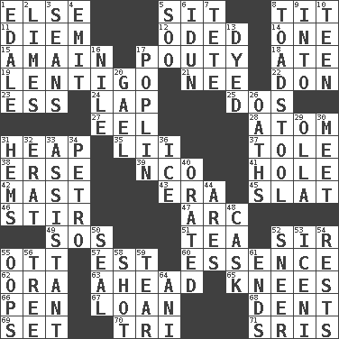 ACROSS 1. Otherwise 5. Be seated 8. Teat (slang) 11. South Vietnam president (1954) 12. Wrote a lyric poem 14. Single 15. With great haste 17. Inclined to pout 18. Had dinner 19. Small, flat, pigmented spot on the skin 21. Born 22. Spanish title 23. Double-curved letter 24. Pet locale 25. Two (Sp.) 27. Snakelike fish 28. Smallest unit of an element 31. Pile 35. Cards in a Roman deck? 37. Lacquered or enameled metalware 38. Celtic language 39. Non-commissioned officer (abbr.) 41. Opening into or through something 42. Vertical spar for supporting sails 43. Period 45. Narrow board 46. Agitate 47. Curve 49. Distress signal 51. Beverage made from leaves 52. Title for a knight 55. Baseball player Mel 57. Eastern Standard Time (abbr.) 60. Gist 62. Mouth or opening 63. Having the leading position 65. Leg joints 66. Animal enclosure 67. Grant temporary use of 68. Scratch 69. Put into a specified state 70. Three (prefix) 71. Indian titles of respect DOWN 1. Peak District village in England 2. Citrus fruits 3. Seines 4. Give off 5. "Barney Miller" actor Jack 6. Goddess of spring and wife of Bragi 7. False hair 8. Inedible or poisonous agaric 9. To the inside or interior of 10. Adolescent 13. Colored 16. "Death on the ____" 17. Cotton for raincoats, e.g. 20. Highlander 26. Profane or obscene expressions 29. Water jar 30. Confront 31. Is hesitant and indecisive 32. Part of Q.E.F. 33. Helper 34. Stone: prefix 36. Frozen water 40. Spoke pompously 44. Ancient Greek god of war 48. Keg 50. Lick closed 52. Contemptuous expression 53. Ancient Celtic tribe of eastern Britain 54. Musical pauses 55. I made a mistake 56. Woody plant 58. Attempt 59. Lacerate 61. Conclusions 64. Cuckoo