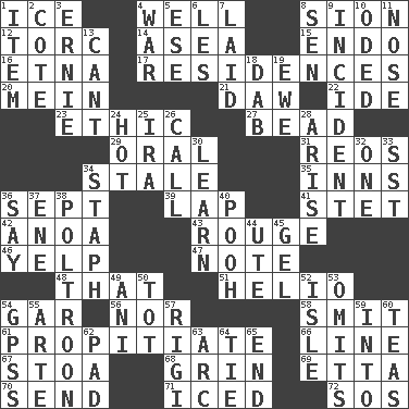 ACROSS 1. Frozen water 4. Not ill 8. The Jewish people; Israel 12. Torque (variant) 14. At sea 15. Inside; within (prefix) 16. Inactive volcano in Sicily 17. Homes 20. Count _ (2 wds.) 21. Obsolete 22. Binary compound 23. Value system 27. Necklace unit 29. Taken by mouth 31. Vintage cars 34. Showing deterioration from age 35. Lodging establishments 36. Back-to-school mo. 39. Pet locale 41. Proofreading order 42. Small Philippine buffalo 43. Makeup applied to the cheeks 46. Sharp bark 47. Musical sound 48. Not this but _ 51. Sun: prefix 54. Slender fish 56. And not 58. Stricken, poetically 61. Appease 66. Actor's bit 67. Portico 68. Broad smile 69. Singer James 70. Transmit 71. On the rocks 72. Mayday DOWN 1. A whole individual unit 2. ____ d'Azur (French Riviera) 3. Bert's buddy 4. Armed conflict 5. Compass dir. 6. French article 7. Put down 8. Elected rep. 9. Happening 10. Wrote a lyric poem 11. Olfactory organ 13. Patter 18. Apply (a substance) by light strokes 19. She-sheep 24. Being at a high temperature 25. Lyricist Gershwin 26. Give a ring to 28. Ascend 30. Memorize 32. Single 33. Fast jet (abbr.) 34. Staphylococcus 36. Declare 37. Compass dir. 38. Coward 40. "Silly old bear" 44. Shoshoni 45. Set 49. Cuckoo 50. Small child 52. Capri or Wright 53. Leaves out 54. Global Positioning Systems (abbr.) 55. Johnson of "Laugh-In" 57. Swiss mountan, "Queen of the Mountains" 59. To the inside or interior of 60. Beverages made from leaves 62. Writing tablet 63. Curve 64. Make a knot 65. Conclusion
