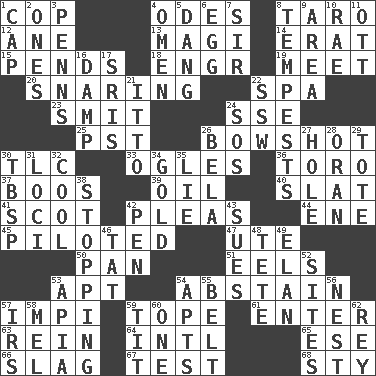 ACROSS 1. Police officer (slang) 4. Lyric poems 8. Edible starchy tuberous root 12. One (Scot) 13. Wise men 14. Part of Q.E.F. 15. Hangs 18. Engineer (abbr.) 19. Confront 20. Catching in a trap 22. Health resort 23. Stricken, poetically 24. Compass dir. 25. Pacific Standard Time (abbr.) 26. The distance a bow sends an arrow 30. Affectionate concern, for short 33. Stares 36. "Corrida" creature 37. Expressions of contempt or scorn 39. Petroleum 40. Narrow board 41. Native of Scotland 42. Entreaties 44. Compass dir. 45. Manned the helm 47. Shoshoni 50. Baking dish 51. Snakelike fish 53. Fitting 54. Refrain by choice 57. Body of Kaffir warriors 59. Drink excessively 61. Keyboard key 63. It's straight from the horse's mouth 64. International (abbr.) 65. Compass dir. 66. Volcanic refuse 67. Trial 68. Filthy place DOWN 1. Head covering 2. Singles 3. Actor Sean's family 4. Sign of something about to happen 5. Mild oath, euphamism for damn 6. Ovum 7. Title for a knight 8. Storms 9. Length times width 10. Actress Charlotte 11. Baseball player Mel 16. Moist 17. Indian titles of respect 21. "Tell ____ the Marines!" 22. Compass dir. 24. Mayday 26. Actor Lugosi 27. Hollow 28. Northwest Algerian city 29. Carryall 30. Cook's measure (abbr.) 31. Event scenes 32. Calm and collected 34. Aureate 35. Untruth 38. Ceasing 42. Fenced enclosure 43. Takes to court 46. Make lace 48. Wig 49. Style 52. Locates 53. Capital of Western Samoa 54. Tenement units (abbr.) 55. Waist strap 56. A home for chicks 57. Big collection agency 58. Cartoonist voice _ Blanc 59. Teat (slang) 60. Single 62. Marina Del _, California