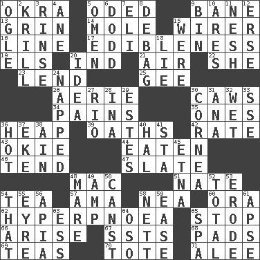 ACROSS 1. Gumbo ingredient 5. Wrote a lyric poem 9. Object of repulsion 13. Broad smile 14. Undercover agent 15. One who wires 16. Actor's bit 17. The property of being fit to eat 19. Raised railways 20. Indiana (abbr.) 21. Wind 22. A female animal or person 23. Grant temporary use of 25. Turn to the right 26. Nest on high 30. Crow sounds 34. Aches 35. Singles 36. Pile 39. Profane or obscene expressions 42. Assign a rank or rating to 43. Migrant worker of the '30s 44. Consumed 46. Look after 47. Schedule 48. Apple computer (short form) 51. Nathan's nickname 54. Beverage made from leaves 57. Wet nurse (var.) 58. Teachers' org. 60. Mouth or opening 62. Abnormally rapid or deep breathing 65. Discontinue 66. Get up 67. Fast planes 68. Groovy apts. 69. Beverages made from leaves 70. Lug 71. Toward shelter DOWN 1. Stare at amorously 2. Shrimp-like planktonic crustaceans 3. Remove soap 4. One (Scot) 5. Presage 6. Texas town _ City 7. Connecticut Ivy Leaguer 8. Debunk (Brit. slang) 9. Storage container 10. Ancient Greek god of war 11. Delicate 12. Celtic language 15. We are 18. Whopper 20. The content of cognition 24. Slept 27. _ de Janeiro 28. _ tizzy (2 wds.) 29. _____ Park, CO 30. Pupil covering 31. Santa ___, CA 32. Dripping 33. Compass dir. 36. Being at a high temperature 37. Make supply last 38. The 18th letter of the Arabic alphabet 40. Actor Linden 41. R.R. building 45. Inactive volcano in Sicily 48. Female horse 49. Electrical Unit 50. 2nd pers. sing. pres. of can (arch.) 52. Add up to 53. Eat (away) 54. Not this but _ 55. Jane of fiction 56. Capital of Western Samoa 58. Remaining after all deductions 59. Relaxation 61. Domed church section 63. Double-curved letter 64. Bear (Spanish) 65. Health resort