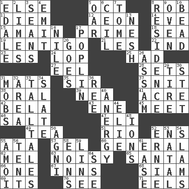 ACROSS 1. Otherwise 5. Sep. follower 8. Director Reiner 11. South Vietnam president (1954) 12. A really long time 14. First lady 15. At full speed 17. A-one 18. Ocean 19. Small, flat, pigmented spot on the skin 21. French article 22. Working for oneself (abbr.) 23. Curvy letter 24. Chop off 25. Possessed 27. Snakelike fish 28. Puts into a specified state 31. Floor protectors 35. Title for a knight 37. In a ____ (agitated or irritated) 38. Of the mouth 39. Teachers' org. 41. 1/640 square mile 42. Actor Lugosi 43. Compass dir. 45. Confront 46. Table seasoning 47. Biblical high priest 49. Afternoon social gathering 51. River (Sp.) 52. Followers of ems 55. _ moment's notice (2 wds.) 57. Set 60. Commissioned military rank 62. Cartoonist voice _ Blanc 63. Annoyingly loud 65. Before Barbara or Clara 66. Single 67. Restaurants 68. Thailand, formerly 69. ___ a Wonderful Life 70. Observe 71. Snakelike fish DOWN 1. Peak District village in England 2. Citrus fruits 3. Actors Connery and Penn 4. Send forth 5. Boat paddle 6. To provide with a ceiling 7. Heavy book 8. Home 9. Baking chamber 10. Necklace unit 13. Tender 16. "Death on the ____" 17. Cotton for raincoats, e.g. 20. Travels 26. Indian state 29. Become fatigued 30. Proofreading order 31. Disorderly crowds 32. Length times width 33. Baron Munchausen's specialties 34. Schedule 36. To riddle 40. Disorder of the immune system 44. Writer Wiesel 48. Charged particles 50. Hindu god of fire 52. Bert's buddy 53. Relating to or accompanying birth 54. Shuts with force 55. Mine, in Marseilles 56. Portable shelter 58. Immeasurably long periods of time 59. Actor's bit 61. Comfort 64. Compass dir.