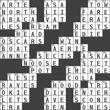 ACROSS 1. Johnson of "Laugh-In" 5. White ___ sheet 8. Pull behind 11. Compass direction 13. Cards in a Roman deck? 14. Conductor's collection 15. Phillipine bananalike plant 16. Large container 17. Part of Q.E.F. 18. French article 19. 480, 500 or 516 sheets of paper 21. Musical pauses 22. Froth on beer 24. Singer Brickell 25. Motion picture awards 27. Victory 29. Water vessel 30. Nest on high 32. Singer Murray 33. Religious groups 35. "____ silly question..." 39. Trap for birds or small mammals 41. Proofreading order 42. Plant holder 43. Develop 45. For fear that 48. Root beer relative 49. All-night dance parties 50. Parka part 52. Three (prefix) 55. Migrant worker of the '30s 56. HTML Container Element 57. Keyboard key 59. Allows 60. "___ Maria" 61. Biscuitlike quick bread 62. Epoch 63. Benjamin's nick name 64. Singles DOWN 1. Of or related to the anus 2. Loose flowing garment 3. File 13 4. And so on (abbr.) 5. Inventor's middle name 6. Thailand, formerly 7. Small island 8. Tarsus (plural) 9. Declaim 10. Moistens 12. Ethiopian city, capital of Harari 14. Nourish 20. Begley and Asner 21. Painter Guido (1575-1642) 23. Ingested 25. Chief or king in Benin or Nigeria 26. Male child 27. Dripping 28. Big collection agency 30. Adept person 31. Artist's stand 33. "Barney Miller" actor Jack 34. Eastern Standard Time (abbr.) 36. Ski resort town in Vermont 37. Cask 38. Had dinner 40. Chooses 43. Environmental prefix 44. Methods 45. Member of a famous L.A. basketball team 46. Webber/Rice musical 47. Observes 49. Hero or heavy, e.g. 50. Hub of activity 51. Baking chamber 53. French philosopher Descartes 54. Angers 56. Apply (a substance) by light strokes 58. Non-commissioned officer (abbr.)